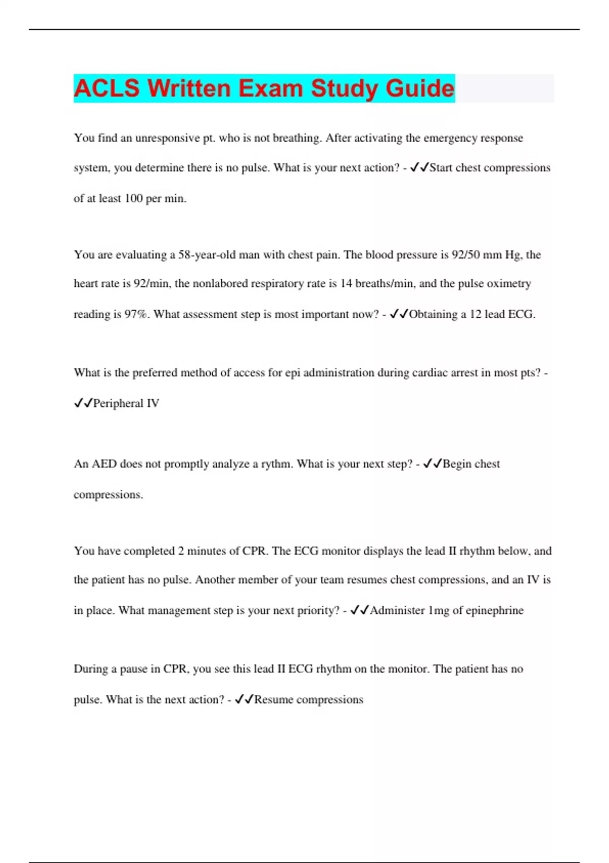ACLS Written Exam Study Guide | 135 Questions with 100% Correct Answers | Updated & Verified | 22 Pages