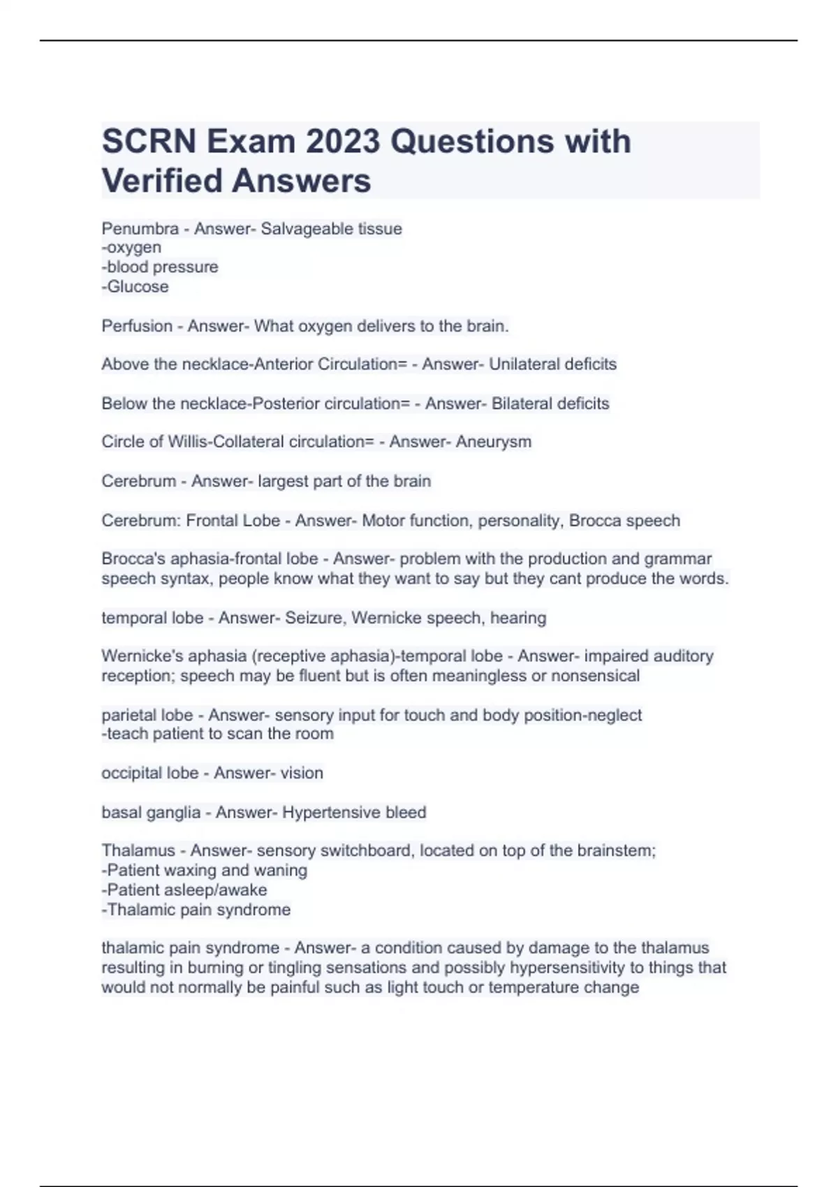 Penumbra - Answer- Salvageable tissue -oxygen -blood pressure -Glucose Perfusion - Answer- What oxygen delivers to the brain. Above the necklace-Anterior Circulation= - Answer- Unilateral deficits Below the necklace-Posterior circulation= - Answer- Bilateral deficits Circle of Willis-Collateral circulation= - Answer- Aneurysm Cerebrum - Answer- largest part of the brain Cerebrum: Frontal Lobe - Answer- Motor function, personality, Brocca speech Brocca's aphasia-frontal lobe - Answer- problem with the production and grammar speech syntax, people know what they want to say but they cant produce the words. temporal lobe - Answer- Seizure, Wernicke speech, hearing Wernicke's aphasia (receptive aphasia)-temporal lobe - Answer- impaired auditory reception; speech may be fluent but is often meaningless or nonsensical parietal lobe - Answer- sensory input for touch and body position-neglect -teach patient to scan the room occipital lobe - Answer- vision basal ganglia - Answer- Hypertensive bleed Thalamus - Answer- sensory switchboard, located on top of the brainstem; -Patient waxing and waning -Patient asleep/awake -Thalamic pain syndrome thalamic pain syndrome - Answer- a condition caused by damage to the thalamus resulting in burning or tingling sensations and possibly hypersensitivity to things that would not normally be painful such as light touch or temperature change Cerebellum - Answer- Balance and coordination Left (Dominant) Hemisphere Stroke - Answer- -Left gaze preference (looks toward stroke area) -Right hononomous hemianopia -Right hemiparesis -Right hemisensory loss -Aphasia Right (Nondominant) Hemisphere Stroke - Answer- -Right gaze preference -Left hononomous hemianopia -Left hemiparesis, plegia -Left hemisensory loss *Neglect-left *Agnosia (failure to recognize objects) Posterior circulating stroke syndromes= - Answer- Wallenburg (Medulla) Horner's Syndrome Wallenberg syndrome - Answer- Nystagmus, Vertigo Horner's syndrome - Answer- ipsilateral ptosis miosis anhidrosis Ipsilateral - Answer- on the same side of the body Contralateral - Answer- on the opposite side of the body Miosis - Answer- constricted pupils anhidrosis - Answer- absence of sweating Locked-in syndrome - Answer- PONS How do you communicate with someone with locked-in syndrome? - Answer- Blinking eye movement Cerebral Venous Thrombosis - Answer- Hypercoagulopathy state Post-partum/PREGNANCY Carotid or Vertebral dissection-TRAUMA - Answer- Trauma most common cause TX: anticoagulation Arterio-venous Fistula - Answer- Ptosis-eyeball pops out Hears swishing Carotid Cavernous Fistula - Answer- Arterial venous connection between carotid artery and cavernous sinus---"the bulging red eye" -can be high-flow or low-flow -high flow results in patients with atherosclerosis and HTN with carotid aneurysms that rupture within sinus or secondary to closed head trauma (*basal skull fracture*) -S&S of high-flow: headache and confusion; *orbital bruit Carotid cavernous fistula (CCF) - Answer- Type A-High pressure Type B-Low pressure Type C-Low pressure Type D-Low pressure Moyamoya disease - Answer- "Puff of Smoke" Japanese, young female, genetic Small, thin walled torturous arteries Spontaneous stenosis, eventual occlusion TX: antiplatelet, CCB, surgery Moyamoya - Answer- Small, thin walled torturous arteries TX: surgery-re-establish blood flow to ischemic area SYNANGIOSIS- creation of new vessels Vasculitis- - Answer- Inflammation of blood vessels Answer: Steriod cavernous angioma - Answer- "less common than AVM. Similar to cavernous angioma elsewhere (liver). Formed by large irregular thin-walled vascular channels. Most are asymptomatic, may cause bleeding, epilepsy, or focal neuro problems" CT Scan=PURPLE LESION Dural arteriovenous fistula - Answer- Abnormal arteriovenous shunts that occur in the POSTERIOR DURA Usually acquired from trauma and associated with obstruction of venous sinus Stroke mimics - Answer- -Todd's Paralysis (postictal) -migraine with aura -Bell's Palsy -Hypoglycemia -MS -Hypertensive encephalopathy -Wernicke's -Central venous sinus thrombosus -ICH - SAH/SDH/EDH -Brain tumor -Conversion disorder -Meningitis/Encephalitis/Abscess TIA - Answer- transient ischemic attack....mini stroke, no dead tissue. Warning sign of potential or future stroke Symptoms resolve in minutes to hours No permanent neurological deficits Visual difficulties Carotid stenosis Carotid endarectomy Ischemic stroke - Answer- a type of stroke that occurs when the flow of blood to the brain is blocked Neuroplasticity - Answer- is remodeling process of the brain -creating new pathways via PT, OT, Speech -Neuroplasticity of penumbra is continuous repetition of the deficit-ROBOTIC repetition. Neuroplasticity & Stroke Recovery - Answer- Begins 1-3 days post stroke -Regains lost function after injury -Success of recovery depends on DESIRE of individual to gain functional ability The BE FAST acronym stands for: - Answer- Balance Eyes Face Arms Speech Time 7 D's of stroke care - Answer- Detection-Facial droop, arm weakness Dispatch-Ambulance gets PT Delivery-Pt deliver to ER Door-Pt arrives Data-CT scan Decision-Should tPA be given Drug-what drug Door to treatment Times - Answer- Door to ED physician exam=10 min Door to Stroke expertise=15 min Door to CT scan= 20 min Door to CT interpretation= 45 min Door to lab results= 45 min Door to Drug (rt-PA)= 60 min (2018: 45 min) A CT Scan without contrast can reveal what in the presence of headache? - Answer- Blood/Hemorrhage Blood is WHITE Ischemia/edema does not show up for 12-24 hours Brain parenchyma is gray Hypodensity on CT Scan - Answer- Hypo