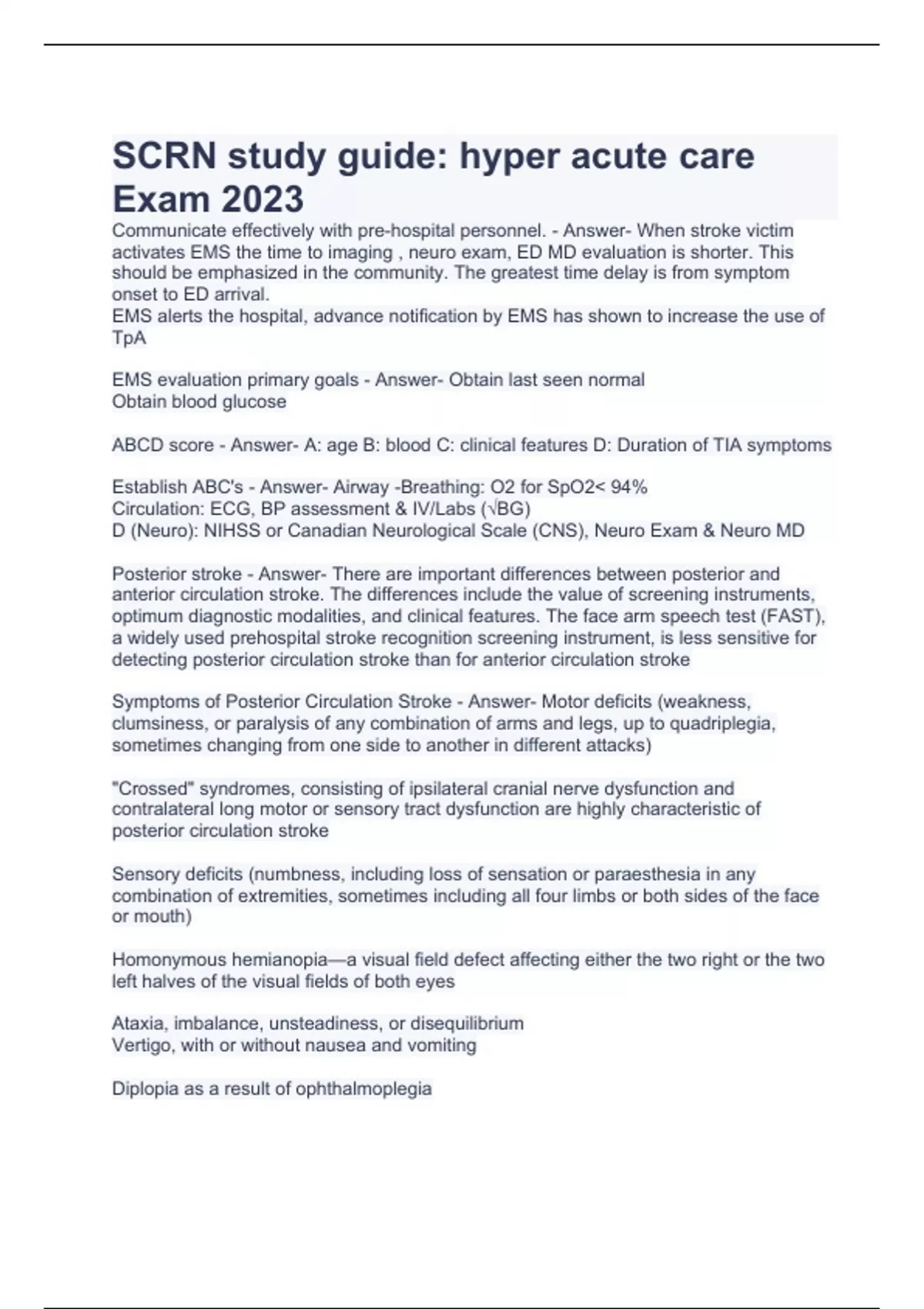 Communicate effectively with pre-hospital personnel. - Answer- When stroke victim activates EMS the time to imaging , neuro exam, ED MD evaluation is shorter. This should be emphasized in the community. The greatest time delay is from symptom onset to ED arrival. EMS alerts the hospital, advance notification by EMS has shown to increase the use of TpA EMS evaluation primary goals - Answer- Obtain last seen normal Obtain blood glucose ABCD score - Answer- A: age B: blood C: clinical features D: Duration of TIA symptoms Establish ABC's - Answer- Airway -Breathing: O2 for SpO2< 94% Circulation: ECG, BP assessment & IV/Labs (√BG) D (Neuro): NIHSS or Canadian Neurological Scale (CNS), Neuro Exam & Neuro MD Posterior stroke - Answer- There are important differences between posterior and anterior circulation stroke. The differences include the value of screening instruments, optimum diagnostic modalities, and clinical features. The face arm speech test (FAST), a widely used prehospital stroke recognition screening instrument, is less sensitive for detecting posterior circulation stroke than for anterior circulation stroke Symptoms of Posterior Circulation Stroke - Answer- Motor deficits (weakness, clumsiness, or paralysis of any combination of arms and legs, up to quadriplegia, sometimes changing from one side to another in different attacks) "Crossed" syndromes, consisting of ipsilateral cranial nerve dysfunction and contralateral long motor or sensory tract dysfunction are highly characteristic of posterior circulation stroke Sensory deficits (numbness, including loss of sensation or paraesthesia in any combination of extremities, sometimes including all four limbs or both sides of the face or mouth) Homonymous hemianopia—a visual field defect affecting either the two right or the two left halves of the visual fields of both eyes Ataxia, imbalance, unsteadiness, or disequilibrium Vertigo, with or without nausea and vomiting Diplopia as a result of ophthalmoplegia Dysphagia or dysarthria Isolated reduced level of consciousness is not a typical stroke symptom but can result from bilateral thalamic or brainstem ischaemia (especially from rostral basilar artery occlusion) Posterior stroke: Lateral medulla (intracranial vertebral artery infarct, also known as Wallenberg syndrome) - Answer- Nystagmus, vertigo, ipsilateral Horner's syndrome, ipsilateral facial sensory loss, dysarthria, hoarseness, and dysphagia Contralateral hemisensory loss in the trunk and limb—pain and temperature posterior stroke: Medial medulla - Answer- Ipsilateral tongue weakness and later hemiatrophy of the tongue Contralateral hemiparesis of the arm and leg Hemisensory loss—touch and proprioception posterior stroke: Pons - Answer- Hemiparesis or hemisensory loss, ataxic hemiparesis, dysarthria, horizontal gaze palsy Complete infarction causes "locked-in syndrome" with quadriparesis, loss of speech, but preserved awareness and cognition, and sometimes preserved eye movements posterior stroke:Top of the basilar (distal basilar occlusion) - Answer- Somnolence, confusion (from thalamic infarction) Bilateral loss of vision, unawareness or denial of blindness (from bilateral occipital infarction) posterior stroke: Posterior inferior cerebellar artery - Answer- Truncal ataxia, vertigo (limb ataxia may occur, especially if the inferior cerebellar peduncle is affected) posterior stroke: Posterior cerebral artery - Answer- Contralateral homonymous hemianopia (from occipital infarction) Hemisensory loss—all modalities (from thalamic infarction) Hemi-body pain—pain (usually with a burning quality) down one side of the body (face, arm, and leg) as a result of thalamic infarction If bilateral, may have poor visual-motor coordination, inability to understand visual objects Symptoms of Anterior Circulation Stroke - Answer- Patients typically present with sudden onset of focal neurological symptoms. Anterior Circulation Stroke: Left hemisphere (ie, dominant) - Answer- • Right hemiparesis - Variable involvement of face and upper and lower extremity • Right-sided sensory loss in a pattern similar to that of the motor deficit - Usually involves all modalities, decreased stereognosis, and graphesthesia • Right homonymous hemianopia