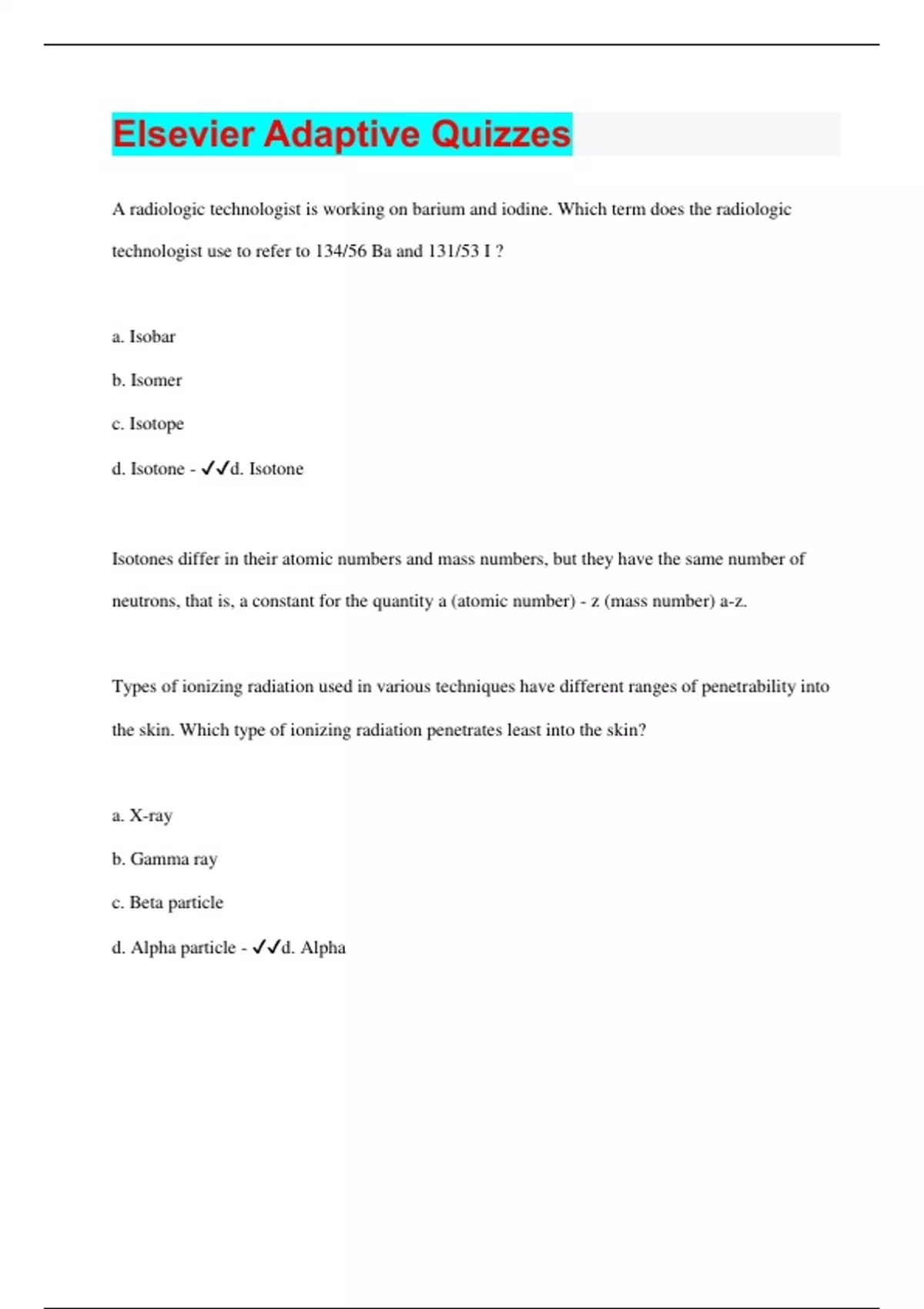 A radiologic technologist is working on barium and iodine. Which term does the radiologic technologist use to refer to 134/56 Ba and 131/53 I ? a. Isobar b. Isomer c. Isotope d. Isotone - d. Isotone Isotones differ in their atomic numbers and mass numbers, but they have the same number of neutrons, that is, a constant for the quantity a (atomic number) - z (mass number) a-z. Types of ionizing radiation used in various techniques have different ranges of penetrability into the skin. Which type of ionizing radiation penetrates least into the skin? a. X-ray b. Gamma ray c. Beta particle d. Alpha particle - d. Alpha