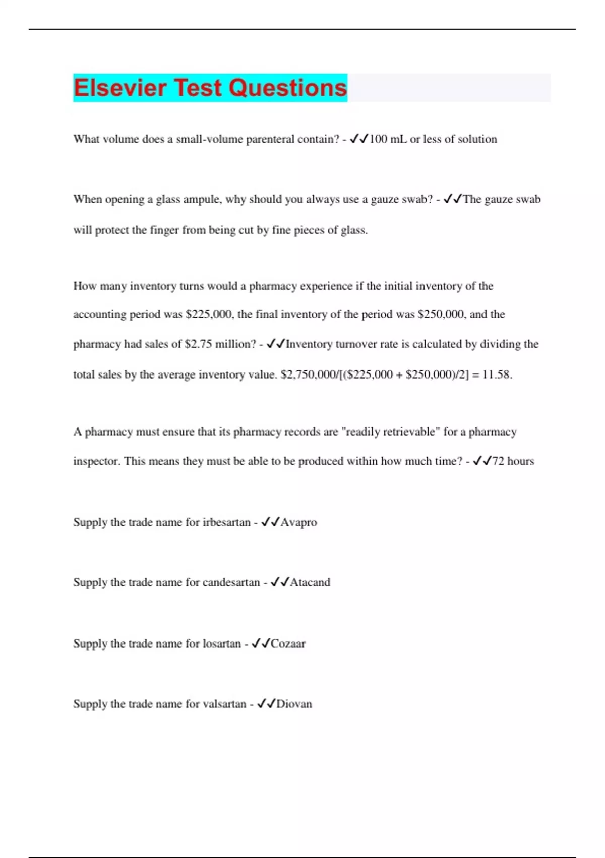 What volume does a small-volume parenteral contain? - 100 mL or less of solution When opening a glass ampule, why should you always use a gauze swab? - The gauze swab will protect the finger from being cut by fine pieces of glass. How many inventory turns would a pharmacy experience if the initial inventory of the accounting period was $225,000, the final inventory of the period was $250,000, and the pharmacy had sales of $2.75 million? - Inventory turnover rate is calculated by dividing the total sales by the average inventory value. $2,750,000/[($225,000 + $250,000)/2] = 11.58. A pharmacy must ensure that its pharmacy records are "readily retrievable" for a pharmacy inspector. This means they must be able to be produced within how much time? - 72 hours Supply the trade name for irbesartan - Avapro Supply