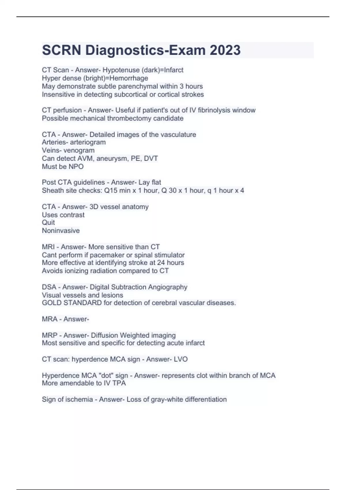 CT Scan - Answer- Hypotenuse (dark)=Infarct Hyper dense (bright)=Hemorrhage May demonstrate subtle parenchymal within 3 hours Insensitive in detecting subcortical or cortical strokes CT perfusion - Answer- Useful if patient's out of IV fibrinolysis window Possible mechanical thrombectomy candidate CTA - Answer- Detailed images of the vasculature Arteries- arteriogram Veins- venogram Can detect AVM, aneurysm, PE, DVT Must be NPO Post CTA guidelines - Answer- Lay flat Sheath site checks: Q15 min x 1 hour, Q 30 x 1 hour, q 1 hour x 4 CTA - Answer- 3D vessel anatomy Uses contrast Quit Noninvasive MRI - Answer- More sensitive than CT Cant perform if pacemaker or spinal stimulator More effective at identifying stroke at 24 hours Avoids ionizing radiation compared to CT DSA - Answer- Digital Subtraction Angiography Visual vessels and lesions GOLD STANDARD for detection of cerebral vascular diseases. MRA - Answer- MRP - Answer- Diffusion Weighted imaging Most sensitive and specific for detecting acute infarct CT scan: hyperdence MCA sign - Answer- LVO Hyperdence MCA "dot" sign - Answer- represents clot within branch of MCA More amendable to IV TPA Sign of ischemia - Answer- Loss of gray-white differentiation DSA angiography - Answe