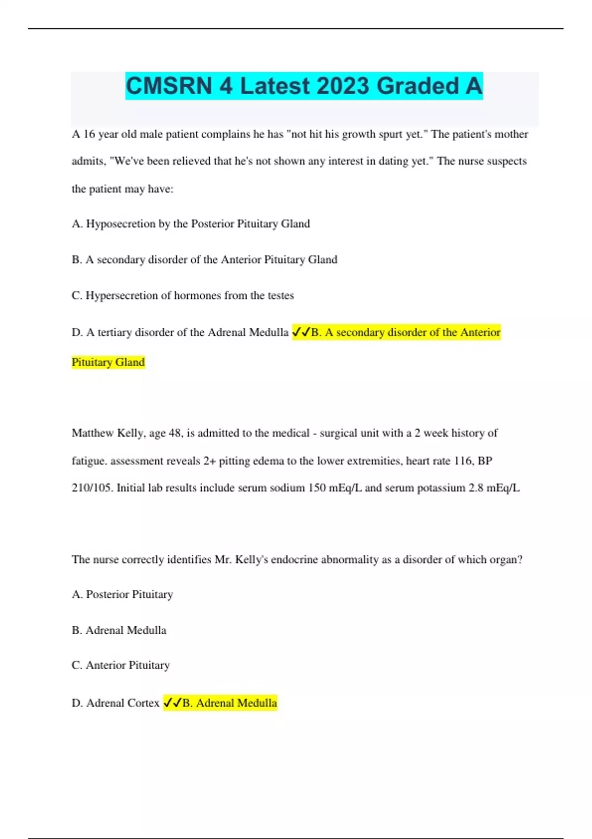 CMSRN 4 Latest 2023 Graded A A 16 year old male patient complains he has "not hit his growth spurt yet." The patient's mother admits, "We've been relieved that he's not shown any interest in dating yet." The nurse suspects the patient may have: A. Hyposecretion by the Posterior Pituitary Gland B. A secondary disorder of the Anterior Pituitary Gland C. Hypersecretion of hormones from the testes D. A tertiary disorder of the Adrenal Medulla B. A secondary disorder of the Anterior Pituitary Gland Matthew Kelly, age 48, is admitted to the medical - surgical unit with a 2 week history of fatigue. assessment reveals 2+ pitting edema to the lower extremities, heart rate 116, BP 210/105. Initial lab results include serum sodium 150 mEq/L and serum potassium 2.8 mEq/L The nurse correctly identifies Mr. Kelly's endocrine abnormality as a disorder of which organ? A. Posterior Pituitary B. Adrenal Medulla C. Anterior Pituitary D. Adrenal Cortex B. Adrenal Medulla Gladys Burns, age 54, is admitted to the medical - surgical unit with a diagnosis of hypoparathyroidism. She was found unresponsive in a homeless shelter. Ms. Burns has a 20 year history of alcoholism. Assessment by the nurse reveals muscle contraction of the fingers and a positive Chvostek's sign. The nurse identifies which electrolyte disorder as contributing to the assessment findings for Ms. Burns? A. Hypernatremia B. Hypomagnesemia C. Hypocalcemia D. Hyperkalemia C. Hypocalcemia Gladys Burns, age 54, is admitted to the medical - surgical unit with a diagnosis of hypoparathyroidism. She was found unresponsive in a homeless shelter. Ms. Burns has a 20 year history of alcoholism. Assessment by the nurse reveals muscle contraction of the fingers and a positive Chvostek's sign. The nurse identifies which of the following as a possible cause of hypoparathyroidism? A. Neck trauma or radiation B. Chronic renal failure C. Hypomagnesemia D. Parathyroid adenoma C. Hypomagnesemia The nurse recognizes the potential for secondary diabetes in a patient with a diagnosis of: A. Addison's Disease B. Hyperthyroidism C. Hypopituitarism D. Hashimoto's Thyroiditis B. Hyperthyroidism A patient with acromegaly asks the nurse about the cause of this disorder. The nurse's response is based on knowledge acromegaly develops due to pathology of which gland? A. Thyroid B. Pituitary C. Pineal D. Adrenal B. Pituitary The nurse is caring for a patient diagnosed with SIADH. The nurse recognizes electrolyte abnormalities in this patient may present as: A. Double Vision B. Bradycardia C. Tachypnea D. Abdominal Cramps D. Abdominal Cramps The nurse should assess the patient with SIADH for which of the following? A. Sudden weight loss B. Increased serum sodium C. High urine specific gravity D. High urine output C. High urine specific gravity The nurse caring for a patient with diabetes insipidus. The primary care provider has ordered intravenous fluid replacement. The nurse recognizes with of the following as an appropriate solution for this purpose? A. Hypertonic saline B. Dextrose 5% in water C. 0.9% saline D. Dextrose 5% in LR B. Dextrose 5% in waer Fluids Replacement Pearls Hypotonic - Hydrates cells to intravascular first .45 NS .33 NS D5W Hypertonic - From the cell D5W 1/2 NS D5 NS D5 LR Isotonic - Intravascular NS LR