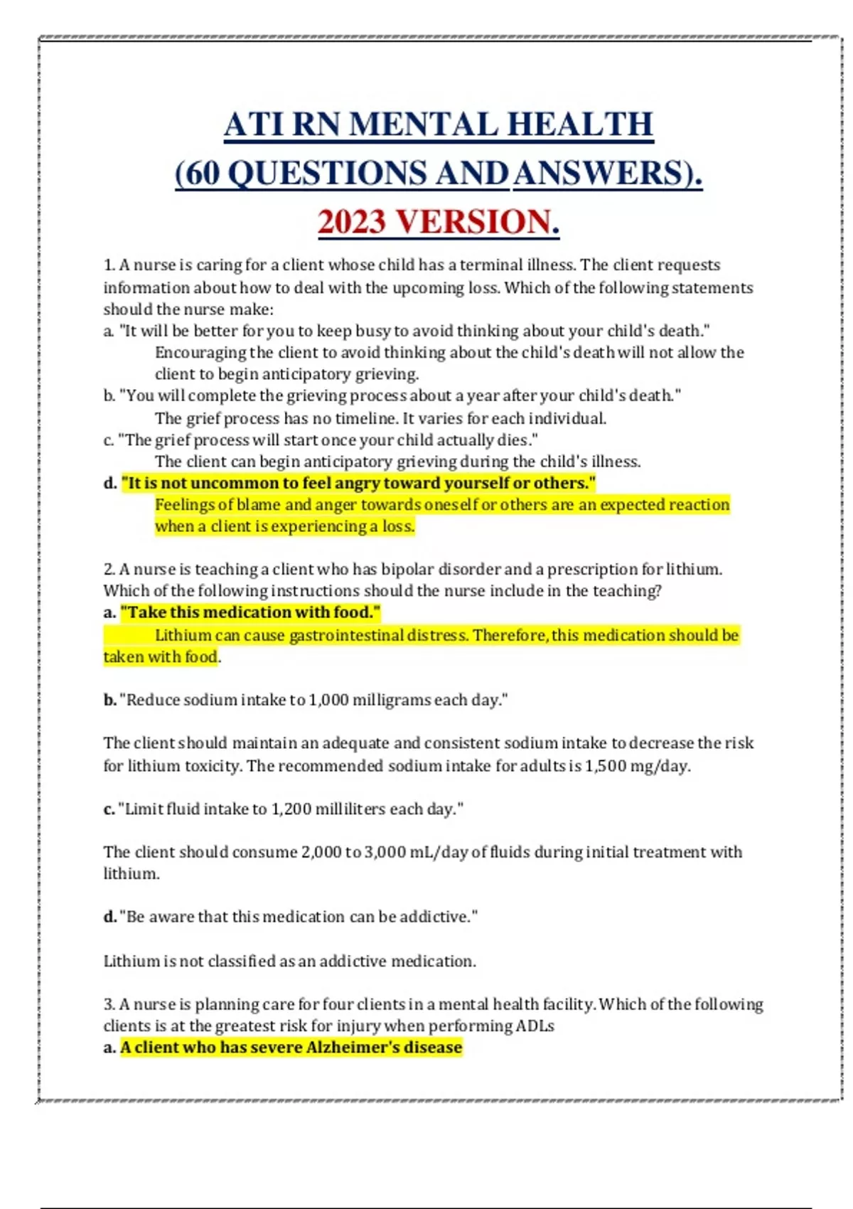 ATI RN MENTAL HEALTH (60 QUESTIONS AND ANSWERS). 2023 VERSION. 1. A nurse is caring for a client whose child has a terminal illness. The client requests information about how to deal with the upcoming loss. Which of the following statements should the nurse make: a. "It will be better for you to keep busy to avoid thinking about your child's death." Encouraging the client to avoid thinking about the child's death will not allow the client to begin anticipatory grieving. b. "You will complete the grieving process about a year after your child's death." The grief process has no timeline. It varies for each individual. c. "The grief process will start once your child actually dies." The client can begin anticipatory grieving during the child's illness. d. "It is not uncommon to feel angry toward yourself or others." Feelings of blame and anger towards oneself or others are an expected reaction when a client is experiencing a loss. 2. A nurse is teaching a client who has bipolar disorder and a prescription for lithium. Which of the following instructions should the nurse include in the teaching? a. "Take this medication with food." Lithium can cause gastrointestinal distress. Therefore, this medication should be taken with food. b. "Reduce sodium intake to 1,000 milligrams each day." The client should maintain an adequate and consistent sodium intake to decrease the risk for lithium toxicity. The recommended sodium intake for adults is 1,500 mg/day. c. "Limit fluid intake to 1,200 milliliters each day." The client should consume 2,000 to 3,000 mL/day of fluids during initial treatment with lithium. d. "Be aware that this medication can be addictive." Lithium is not classified as an addictive medication. 3. A nurse is planning care for four clients in a mental health facility. Which of the following clients is at the greatest risk for injury when performing ADLs a. A client who has severe Alzheimer's disease The greatest risk to this client is injury from performing ADLs. Clients who have severe Alzheimer's disease are typically confused, have memory difficulties, tend to wander, and need assistance to perform ADLs. b. A client who is in the maintenance phase of schizophrenia Clients who are in the maintenance phase of schizophrenia are calm and able to provide self-care with minimal risk for injury. Therefore, another client is at a greater risk for injury. c. A client who has obsessive-compulsive disorder A client who has obsessive-compulsive disorder typically performs ADLs repetitively and precisely. The client should be able to provide self-care with minimal risk for injury. Therefore, another client is at a greater risk for injury. d. A client who has dysthymic disorder Clients who have dysthymic disorder may have low energy or chronic fatigue, but they should be able to provide self-care with minimal risk for injury. Therefore, another client is at a greater risk for injury. 4. A nurse who works with newborns is assessing the potential for abuse or neglect. Which of the following family groups should the nurse identify as the highest potential for future child abuse a. A family in which both parents are adolescents A family in which both parents are adolescents indicates a risk for the parents to become abusive toward the newborn due to lack of experience and knowledge regarding parenting. However, another family group is at a higher risk for potential abuse. b. A family in which the parents respond indifferently toward their newborn A family in which the parents act indifferently about their newborn indicates a risk for the parents to become abusive toward the newborn due to impaired bonding. However, another family group is at a higher risk for potential abuse. c. A family where one or both parents witnessed intimate partner violence in the home as children Parents who witnessed intimate partner violence as children are more likely to become abusive themselves. Therefore, this is the family group with the greatest potential for future child abuse. d. A family in which one or both parents has a developmental disability A family in which one or both parents have a developmental disability indicates a risk for the parents to become abusive toward the newborn due to difficulty learning new skills. However, another family group is at a higher risk for potential abuse. 5. A nurse is performing an admission assessment on a client and notices that the client appears withdrawn and fearful. To establish a trusting nurse-client relationship, which of the following actions should the nurse take first a. Inform the client that her admission is confidential. According to evidence-based practice, the nurse should first inform the client about confidentiality during the orientation phase of the nurse-client relationship. b. Introduce the client to other clients in the day room. The nurse should introduce the client to other clients in the day room to help the client interact with others during the working phase of the nurse-client relationship. However, evidence-based practice indicates that the nurse should take a different action first. c. Assist the client in facilitating behavioral change. The nurse should assist the client with behavioral change during the working phase of the nurse-client relationship. However, evidence-based practice indicates that the nurse should take a different action first. d. Determine coping strategies that the client has used in the past. The nurse should determine what coping strategies the client used in the past during the working phase of the nurse-client relationship. However, evidence-based practice indicates that the nurse should take a different action first. 6. A nurse is admitting a client who has schizophrenia to an acute care setting. When the nurse questions the client regarding his admission, the client states, "I'm red, in the head, and I'm going to bed!" The nurse should document the client's speech pattern as which of the following a. Clang associatio