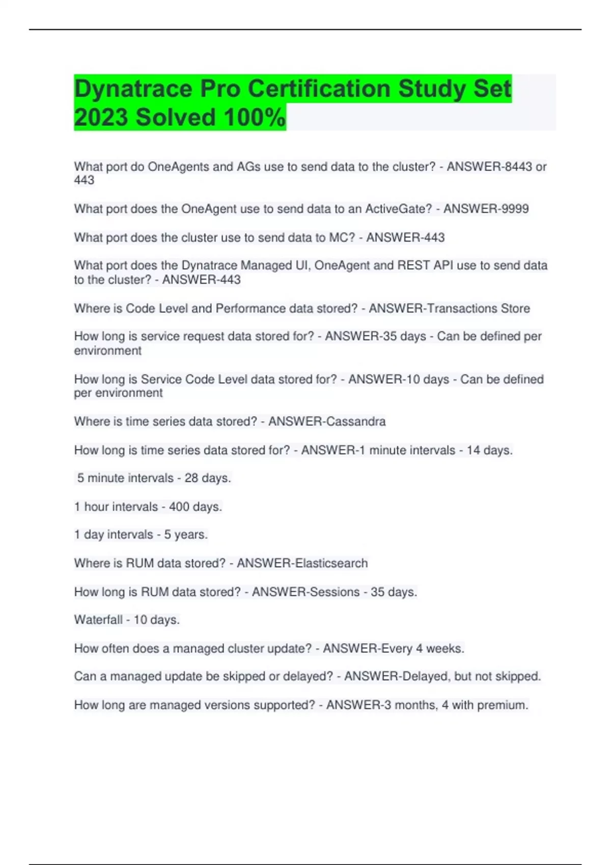 What port do OneAgents and AGs use to send data to the cluster? - ANSWER-8443 or 443 What port does the OneAgent use to send data to an ActiveGate? - ANSWER-9999 What port does the cluster use to send data to MC? - ANSWER-443 What port does the Dynatrace Managed UI, OneAgent and REST API use to send data to the cluster? - ANSWER-443 Where is Code Level and Performance data stored? - ANSWER-Transactions Store How long is service request data stored for? - ANSWER-35 days - Can be defined per environment How long is Service Code Level data stored for? - ANSWER-10 days - Can be defined per environment Where is time series data stored? - ANSWER-Cassandra How long is time series data stored for? - ANSWER-1 minute intervals - 14 days. 5 minute intervals - 28 days. 1 hour intervals - 400 days. 1 day intervals - 5 years. Where is RUM data stored? - ANSWER-Elasticsearch How long is RUM data stored? - ANSWER-Sessions - 35 days. Waterfall - 10 days. How often does a managed cluster update? - ANSWER-Every 4 weeks. Can a managed update be skipped or delayed? - ANSWER-Delayed, but not skipped. How long are managed versions supported? - ANSWER-3 months, 4 with premium.