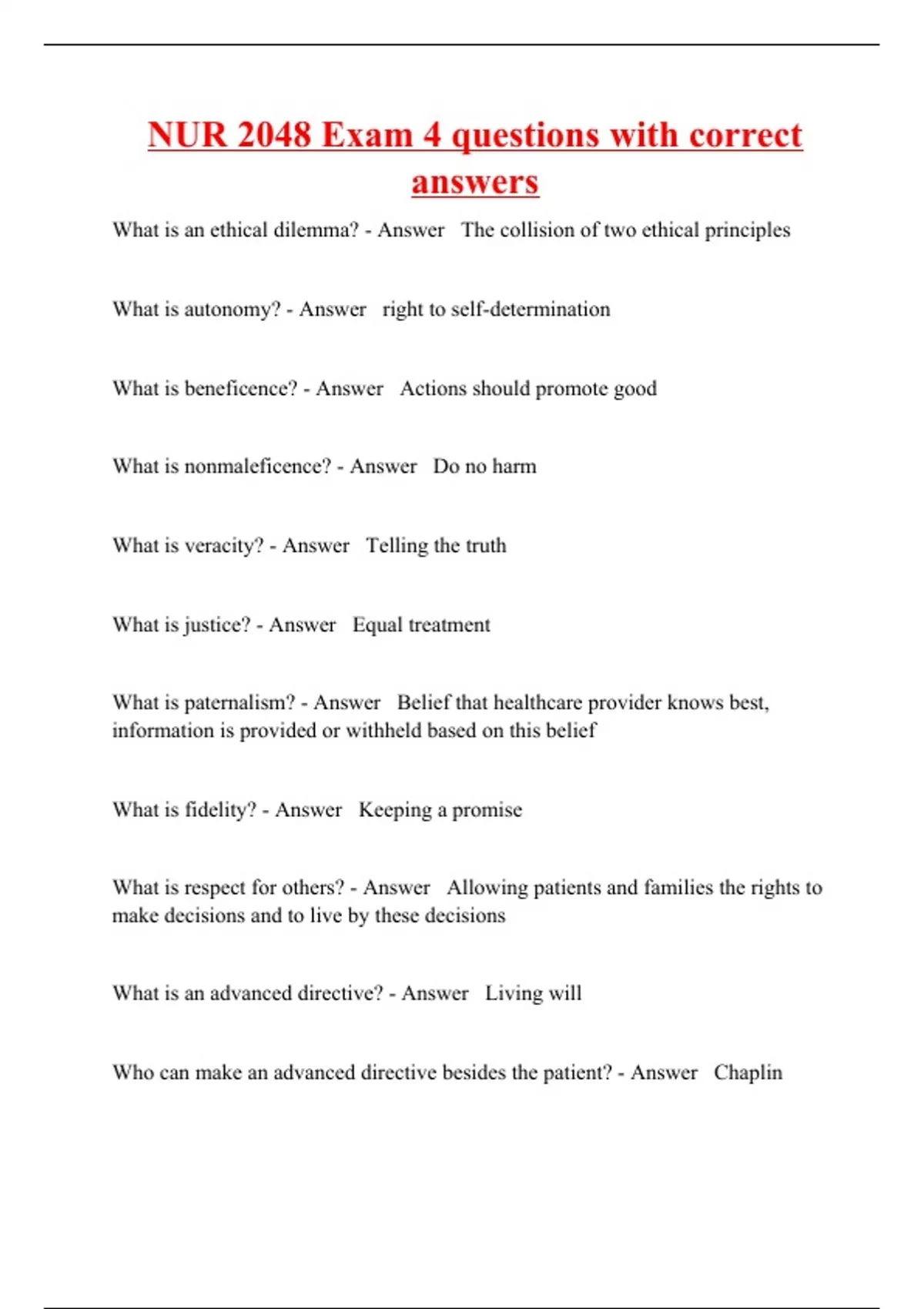 What is an ethical dilemma? - Answer The collision of two ethical principles What is autonomy? - Answer right to self-determination What is beneficence? - Answer Actions should promote good What is nonmaleficence? - Answer Do no harm What is veracity? - Answer Telling the truth What is justice? - Answer Equal treatment What is paternalism? - Answer Belief that healthcare provider knows best, information is provided or withheld based on this belief What is fidelity? - Answer Keeping a promise What is respect for others? - Answer Allowing patients and families the rights to make decisions and to live by these decisions What is an advanced directive? - Answer Living will Who can make an advanced directive besides the p