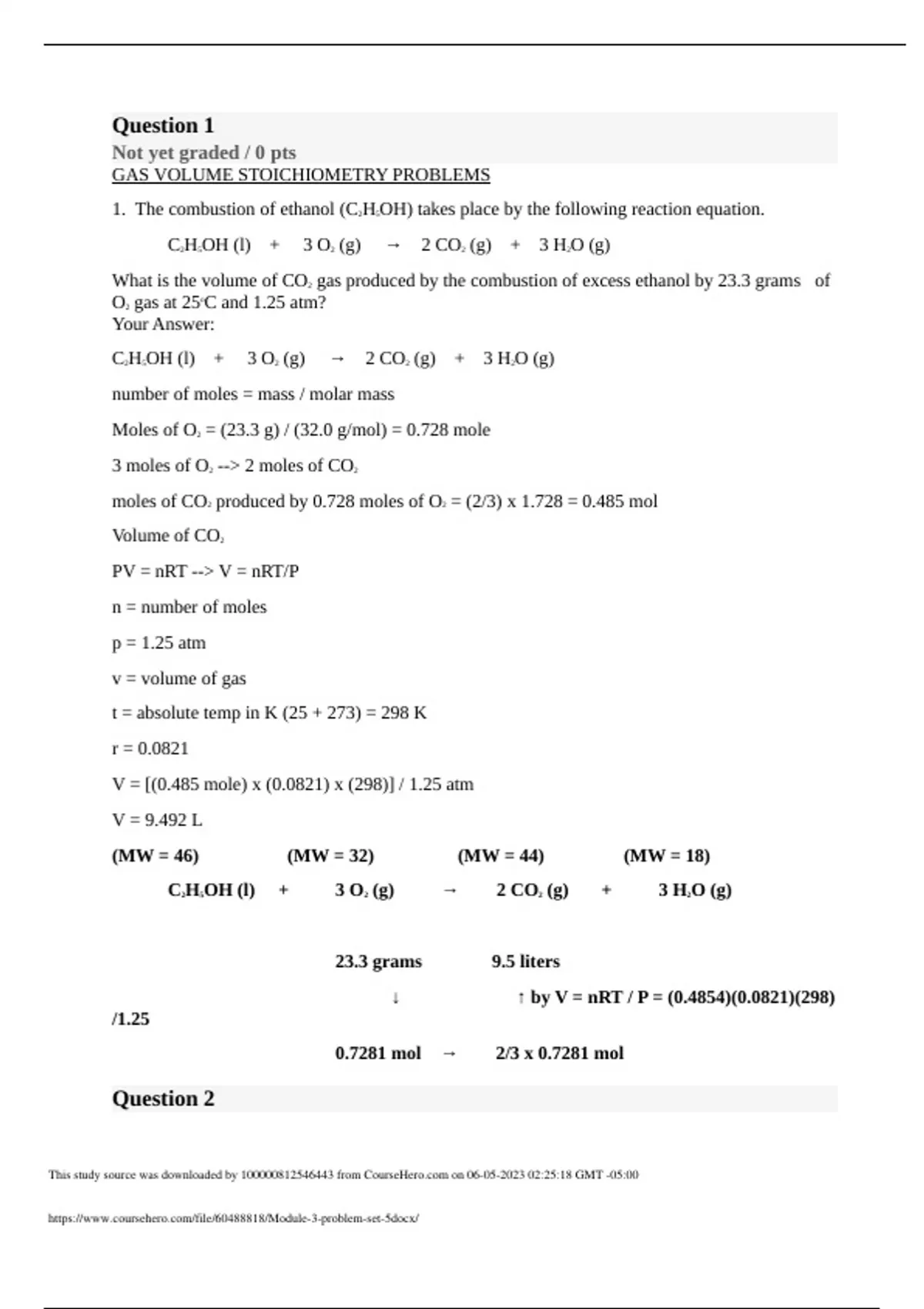 1. The combustion of ethanol (C2H5OH) takes place by the following reaction equation. C2H5OH (l) + 3 O2 (g) → 2 CO2 (g) + 3 H2O (g) What is the volume of CO2 gas produced by the combustion of excess ethanol by 23.3 grams of O2 gas at 25oC and 1.25 atm? Your Answer: C2H5OH (l) + 3 O2 (g) → 2 CO2 (g) + 3 H2O (g) number of moles = mass / molar mass Moles of O2 = (23.3 g) / (32.0 g/mol) = 0.728 mole 3 moles of O2 --> 2 moles of CO2 moles of CO2 produced by 0.728 moles of O2 = (2/3) x 1.728 = 0.485 mol Volume of CO2 PV = nRT --> V = nRT/P n = number of moles p = 1.25 atm v = volume of gas t = absolute temp in K (25 + 273) = 298 K r = 0.0821 V = [(0.485 mole) x (0.0821) x (298)] / 1.25 atm V = 9.492 L (MW = 46) (MW = 32) (MW = 44) (MW = 18) C2H5OH (l