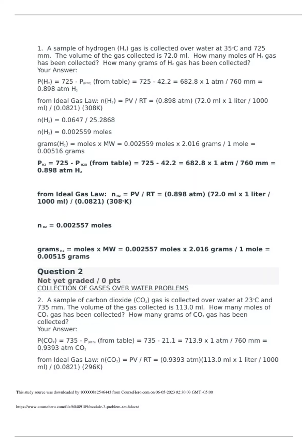 1. A sample of hydrogen (H2) gas is collected over water at 35oC and 725 mm. The volume of the gas collected is 72.0 ml. How many moles of H2 gas has been collected? How many grams of H2 gas has been collected? Your Answer: P(H2) = 725 - P(H2O) (from table) = 725 - 42.2 = 682.8 x 1 atm / 760 mm = 0.898 atm H2 from Ideal Gas Law: n(H2) = PV / RT = (0.898 atm) (72.0 ml x 1 liter / 1000 ml) / (0.0821) (308K) n(H2) = 0.0647 / 25.2868 n(H2) = 0. moles grams(H2) = moles x MW = 0. moles x 2.016 grams / 1 mole = 0.00516 grams PH2 = 725 - P H2O (from table) = 725 - 42.2 = 682.8 x 1 atm / 760 mm = 0.898 atm H2 from Ideal Gas Law: n H2 = PV / RT = (0.898 atm) (72.0 ml x 1 liter / 1000 ml) / (0.0821) (308oK) n H2 = 0. moles grams H2 = moles x MW = 0. moles x 2.016 grams / 1 mole = 0.00515 grams Question 2 Not yet graded / 0 pts COLLECTION OF GA