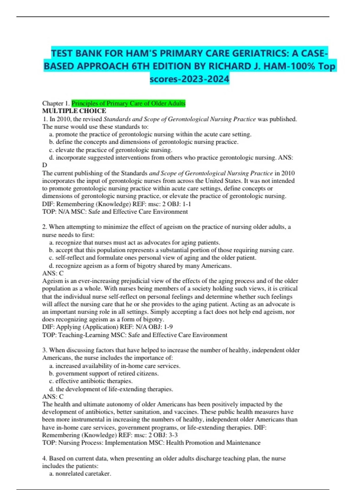 TEST BANK FOR HAM'S PRIMARY CARE GERIATRICS: A CASE-BASED APPROACH 6TH EDITION BY RICHARD J. HAM-100% Top scores-