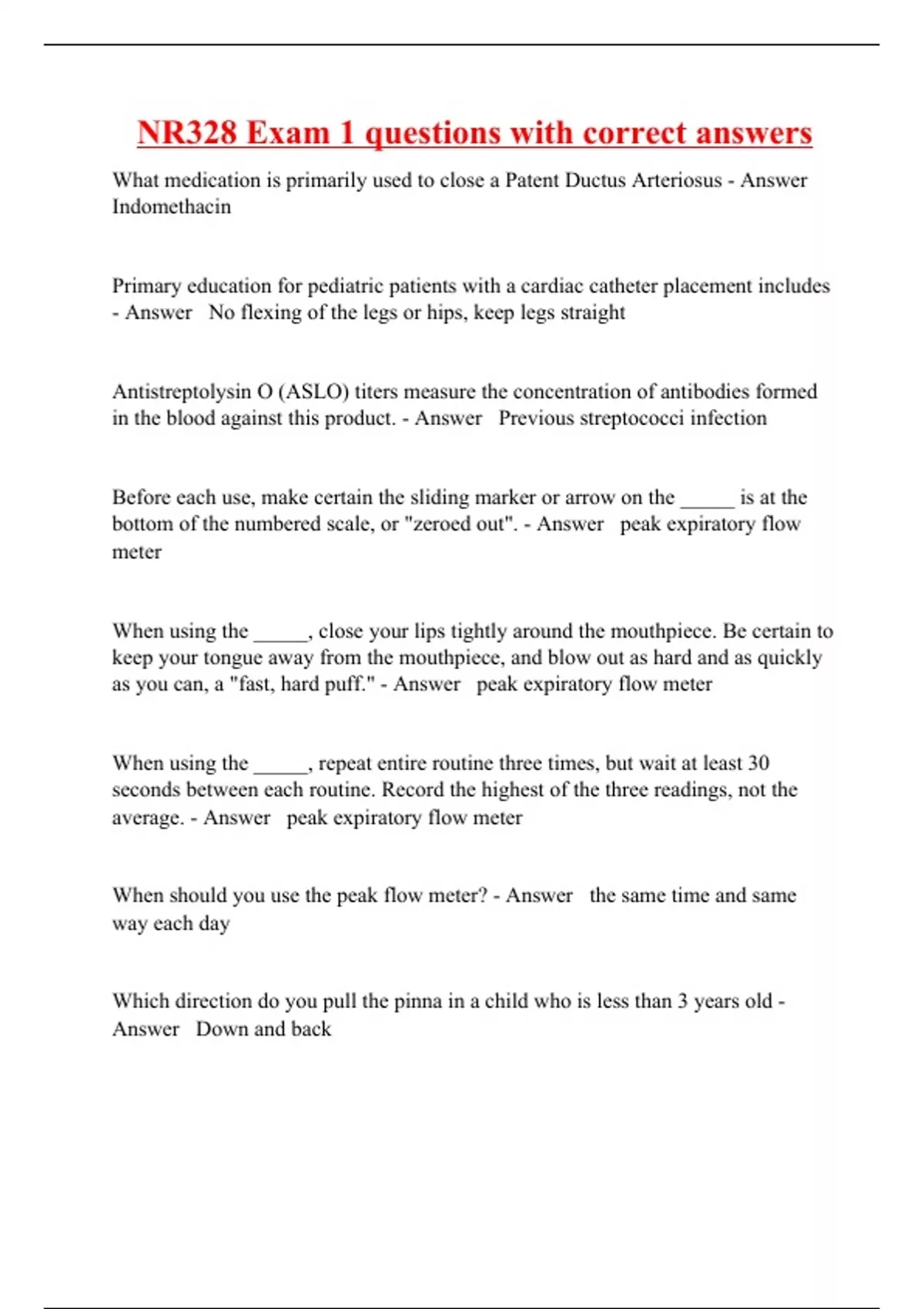 What medication is primarily used to close a Patent Ductus Arteriosus - Answer Indomethacin Primary education for pediatric patients with a cardiac catheter placement includes - Answer No flexing of the legs or hips, keep legs straight Antistreptolysin O (ASLO) titers measure the concentration of antibodies formed in the blood against this product. - Answer Previous streptococci infection Before each use, make certain the sliding marker or arrow on the _____ is at the bottom of the numbered scale, or "zeroed out". - Answer peak expiratory flow meter When using the _____, close your lips tightly around the mouthpiece. Be certain to keep your tongue away from the mouthpiece, and blow out as hard and as quickly as you can, a "fast, hard puff." - Answer peak expiratory flow meter When using the _____, repeat entire routine three times, but wait at least 30 seconds between each routine. Record the highest of the three readings, not the average. - Answer peak expiratory flow meter When should you use the peak flow meter? - Answer the same time and same way each day Which direction do you pull the pinna in a child who is less than 3 years old - Answer Down and back