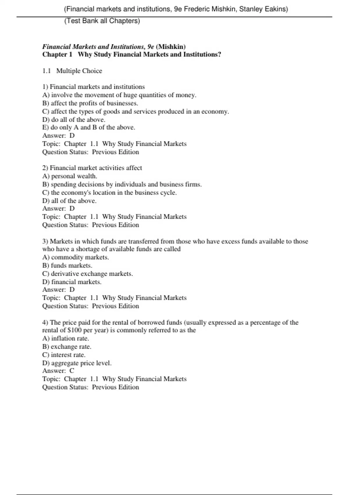 Financial markets and institutions, 9e Frederic Mishkin, Stanley Eakins (Test Bank) Financial markets and institutions, 9e Frederic Mishkin, Stanley Eakins (Test Bank)