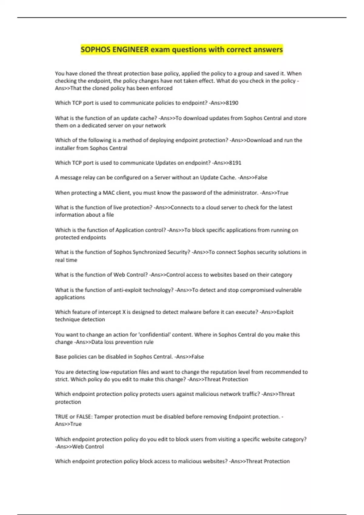 You have cloned the threat protection base policy, applied the policy to a group and saved it. When checking the endpoint, the policy changes have not taken effect. What do you check in the policy - Ans>>That the cloned policy has been enforced Which TCP port is used to communicate policies to endpoint? -Ans>>8190 What is the function of an update cache? -Ans>>To download updates from Sophos Central and store them on a dedicated server on your network Which of the following is a method of deploying endpoint protection? -Ans>>Download and run the installer from Sophos Central Which TCP port is used to communicate Updates on endpoint? -Ans>>8191 A message relay can be configured on a Server without an Update Cache. -Ans>>False When protecting a MAC client, you must know the password of the administrator. -Ans>>True What is the function of live protection? -Ans>>Connects to a cloud server to check for the latest information about a file Which is the function of Application control? -Ans>>To block specific applications from running on protected endpoints What is the function of Sophos Synchronized Security? -Ans>>To connect Sophos security solutions in real time What is the function of Web Control? -Ans>>Control access to websites based on their category What is the function of anti-exploit technology? -Ans>>To detect and stop compromised vulnerable applications Which feature of intercept X is designed to detect malware before it can execute? -Ans>>Exploit technique detection You want to change an action for 'confidential' content. Where in Sophos Central do you make this change -Ans>>Data loss prevention rule Base policies can be disabled in Sophos Central. -Ans>>False You are detecting low-reputation files and want to change the reputation level from recommended to strict. Which policy do you edit to make this change? -Ans>>Threat Protection Which endpoint protection policy protects users against malicious network traffic? -Ans>>Threat protection TRUE or FALSE: Tamper protection must be disabled before removing Endpoint protection. - Ans>>True Which endpoint protection policy do you edit to block users from visiting a specific website category? -Ans>>Web Control Which endpoint protection policy block access to malicious websites? -Ans>>Threat Protection