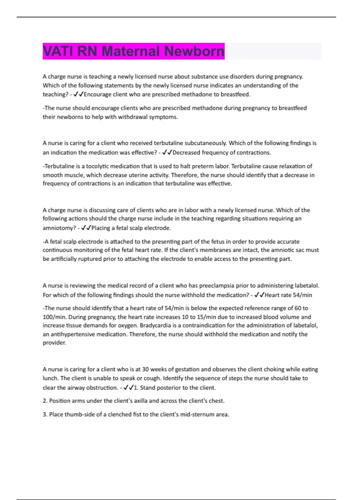 A charge nurse is teaching a newly licensed nurse about substance use disorders during pregnancy. Which of the following statements by the newly licensed nurse indicates an understanding of the teaching? - Encourage client who are prescribed methadone to breastfeed. -The nurse should encourage clients who are prescribed methadone during pregnancy to breastfeed their newborns to help with withdrawal symptoms. A nurse is caring for a client who received terbutaline subcutaneously. Which of the following findings is an indication the medication was effective? - Decreased frequency of contractions. -Terbutaline is a tocolytic medication that is used to halt preterm labor. Terbutaline cause relaxation of smooth muscle, which decrease uterine activity. Therefore, the nurse should identify that a decrease in frequency of contractions is an indication that terbutaline was effective. A charge nurse is discussing care of clients who are in labor with a newly licensed nurse. Which of the following actions should the charge nurse include in the teaching regarding situations requiring an amniotomy? - Placing a fetal scalp electrode. -A fetal scalp electrode is attached to the presenting part of the fetus in order to provide accurate continuous monitoring of the fetal heart rate. If the client's membranes are intact, the amniotic sac must be artificially ruptured prior to attaching the electrode to enable access to the presenting part. A nurse is reviewing the medical record of a client who has preeclampsia prior to administering labetalol. For which of the following findings should the nurse withhold the medication? - Heart rate 54/min -The nurse should identify that a heart rate of 54/min is below the expected reference range of 60 to 100/min. During pregnancy, the heart rate increases 10 to 15/min due to increased blood volume and increase tissue demands for oxygen. Bradycardia is a contraindication for the administration of labetalol, an antihypertensive medication. Therefore, the nurse should withhold the medication and notify the provider. A nurse is caring for a client who is at 30 weeks of gestation and observes the client choking while eating lunch. The client is unable to speak or cough. Identify the sequence of steps the nurse should take to clear the airway obstruction. - 1. Stand posterior to the client. 2. Position arms under the client's axilla and across the client's chest. 3. Place thumb-side of a clenched fist to the client's mid-sternum area.