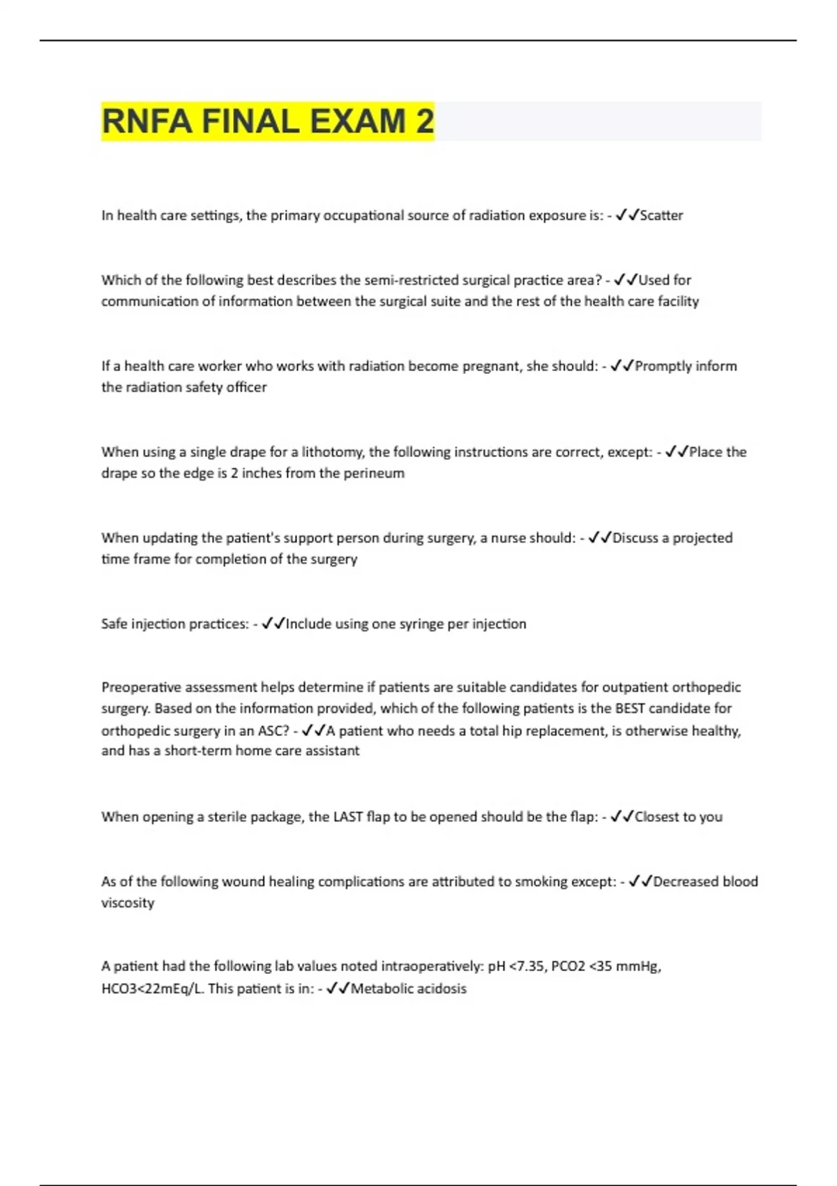 In health care settings, the primary occupational source of radiation exposure is: - Scatter Which of the following best describes the semi-restricted surgical practice area? - Used for communication of information between the surgical suite and the rest of the health care facility If a health care worker who works with radiation become pregnant, she should: - Promptly inform the radiation safety officer When using a single drape for a lithotomy, the following instructions are correct, except: - Place the drape so the edge is 2 inches from the perineum When updating the patient's support person during surgery, a nurse should: - Discuss a projected time frame for completion of the surgery Safe injection practices: - Include using one syringe per injection Preoperative assessment helps determine if patients are suitable candidates for outpatient orthopedic surgery. Based on the information provided, which of the following patients is the BEST candidate for orthopedic surgery in an ASC? - A patient who needs a total hip replacement, is otherwise healthy, and has a short-term home care assistant When opening a sterile package, the LAST flap to be opened should be the flap: - Closest to you As of the following wound healing complications are attributed to smoking except: - Decreased blood viscosity A patient had the following lab values noted intraoperatively: pH <7.35, PCO2 <35 mmHg, HCO3<22mEq/L. This patient is in: - Metabolic acidosis