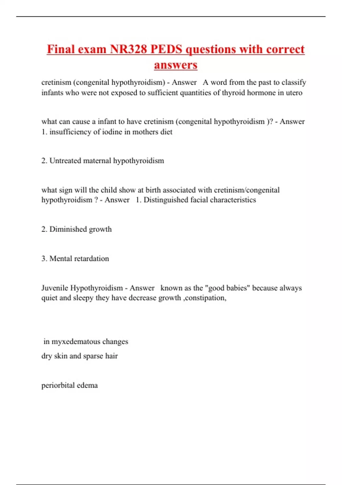 cretinism (congenital hypothyroidism) - Answer A word from the past to classify infants who were not exposed to sufficient quantities of thyroid hormone in utero what can cause a infant to have cretinism (congenital hypothyroidism )? - Answer 1. insufficiency of iodine in mothers diet 2. Untreated maternal hypothyroidism what sign will the child show at birth associated with cretinism/congenital hypothyroidism ? - Answer 1. Distinguished facial characteristics 2. Diminished growth 3. Mental retardation Juvenile Hypothyroidism - Answer known as the "good babies" because always quiet and sleepy they have decrease growth ,constipation, in myxedematous changes dry skin and sparse hair periorbital edema