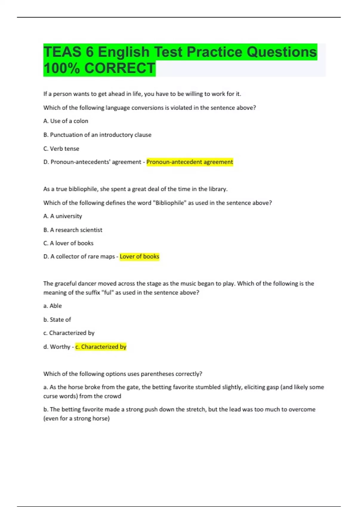 If a person wants to get ahead in life, you have to be willing to work for it. Which of the following language conversions is violated in the sentence above? A. Use of a colon B. Punctuation of an introductory clause C. Verb tense D. Pronoun-antecedents' agreement - Pronoun-antecedent agreement As a true bibliophile, she spent a great deal of the time in the library. Which of the following defines the word "Bibliophile" as used in the sentence above? A. A university B. A research scientist C. A lover of books D. A collector of rare maps - Lover of books The graceful dancer moved across the stage as the music began to play. Which of the following is the meaning of the suffix "ful" as used in the sentence above? a. Able b. State of c. Characterized by d. Worthy - c. Characterized by Which of the following options uses parentheses correctly? a. As the horse broke from the gate, the betting favorite stumbled slightly, eliciting gasp (and likely some curse words) from the crowd b. The betting favorite made a strong push down the stretch, but the lead was too much to overcome (even for a strong horse) c. The announcer (cleared his throat) prepared to call the race from the historic press box at Churchill Downs d. When the leaders reached the midway point ( that several experts tagged) as a long-shot bet began to pull away from the pack - a. As the horse broke from the gate, the betting favorite stumbled slightly, eliciting gasp (and likely some curse words) from the crowd Which of the following sentences correctly employs standard English spelling? a. The students worried that changes to the student council would affect their relationship with school administrators b. The students