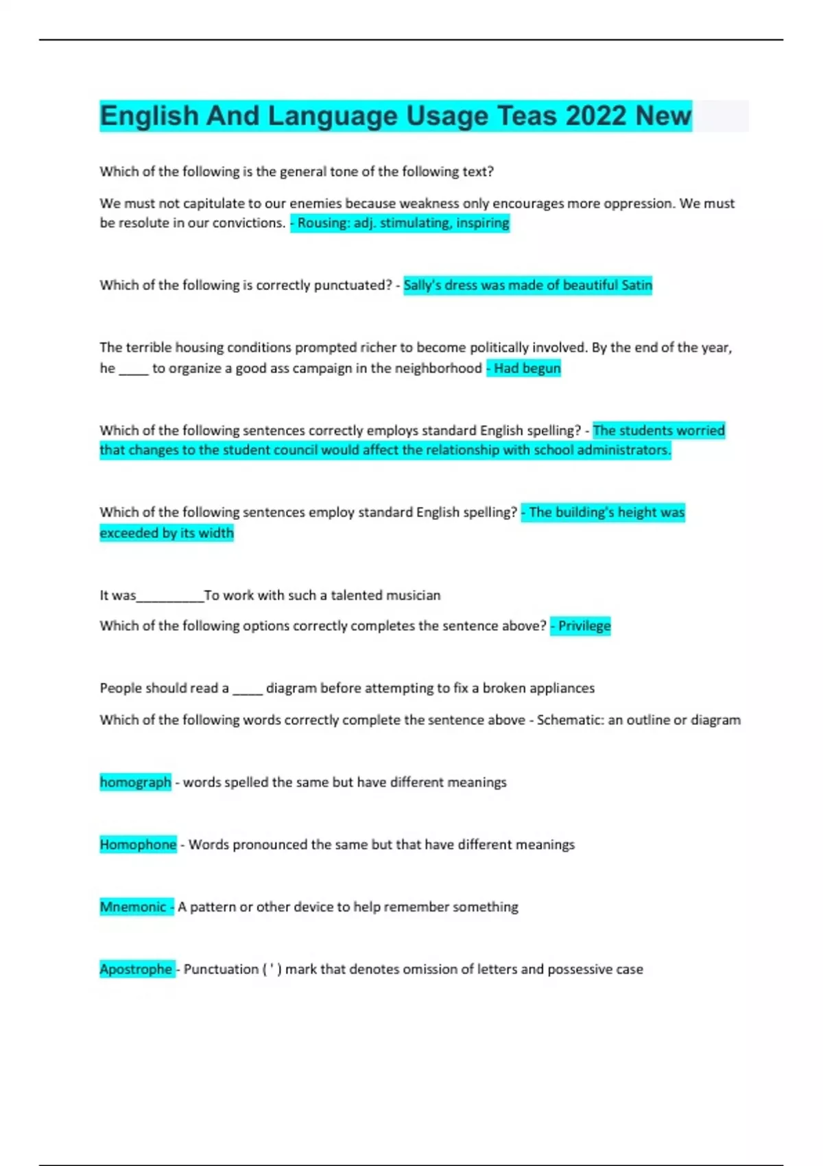 Which of the following is the general tone of the following text? We must not capitulate to our enemies because weakness only encourages more oppression. We must be resolute in our convictions. - Rousing: adj. stimulating, inspiring Which of the following is correctly punctuated? - Sally's dress was made of beautiful Satin The terrible housing conditions prompted richer to become politically involved. By the end of the year, he ____ to organize a good ass campaign in the neighborhood - Had begun Which of the following sentences correctly employs standard English spelling? - The students worried that changes to the student council would affect the relationship with school administrators. Which of the following sentences employ standard English spelling? - The building's height was exceeded by its width It was_________To work with such a talented musician Which of the following options correctly completes the sentence above? - Privilege People should read a ____ diagram before attempting to fix a broken appliances Which of the following words correctly complete the sentence above - Schematic: an outline or diagram homograph - words spelled the same but have different meanings Homophone - Words pronounced the same but that have different meanings Mnemonic - A pattern or other device to help remember something Apostrophe - Punctuation ( ' ) mark that denotes omissi