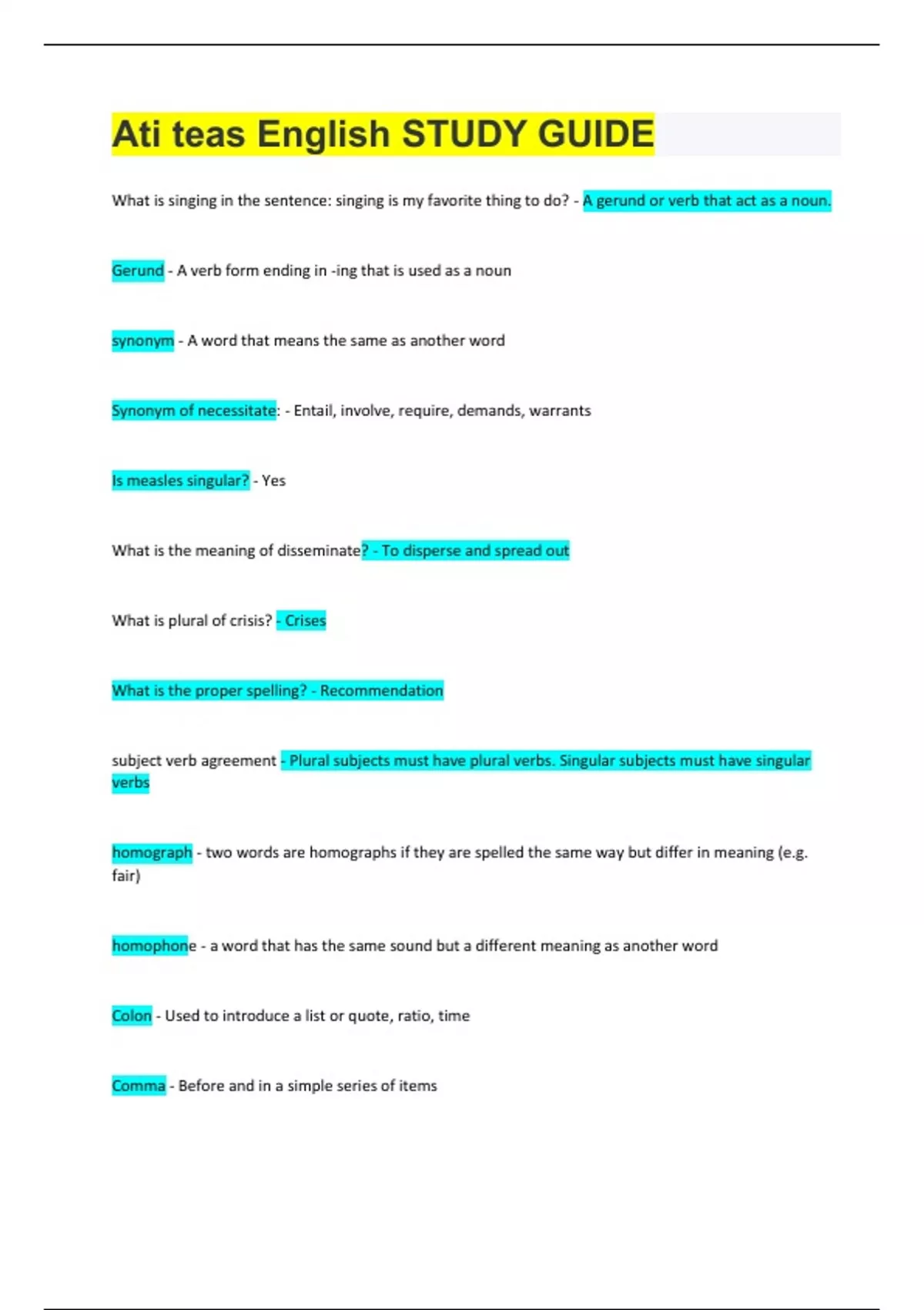 What is singing in the sentence: singing is my favorite thing to do? - A gerund or verb that act as a noun. Gerund - A verb form ending in -ing that is used as a noun synonym - A word that means the same as another word Synonym of necessitate: - Entail, involve, require, demands, warrants Is measles singular? - Yes What is the meaning of disseminate? - To disperse and spread out What is plural of crisis? - Crises What is the proper spelling? - Recommendation subject verb agreement - Plural subjects must have plural verbs. Singular subjects must have singular verbs homograph - two words are homographs if they are spelled the same way but differ in meaning (e.g. fair) homophone - a word that has the same sound but a different meaning as another word Colon - Used to introduce a list or quote, ratio, time Comma - Before and in a simple series