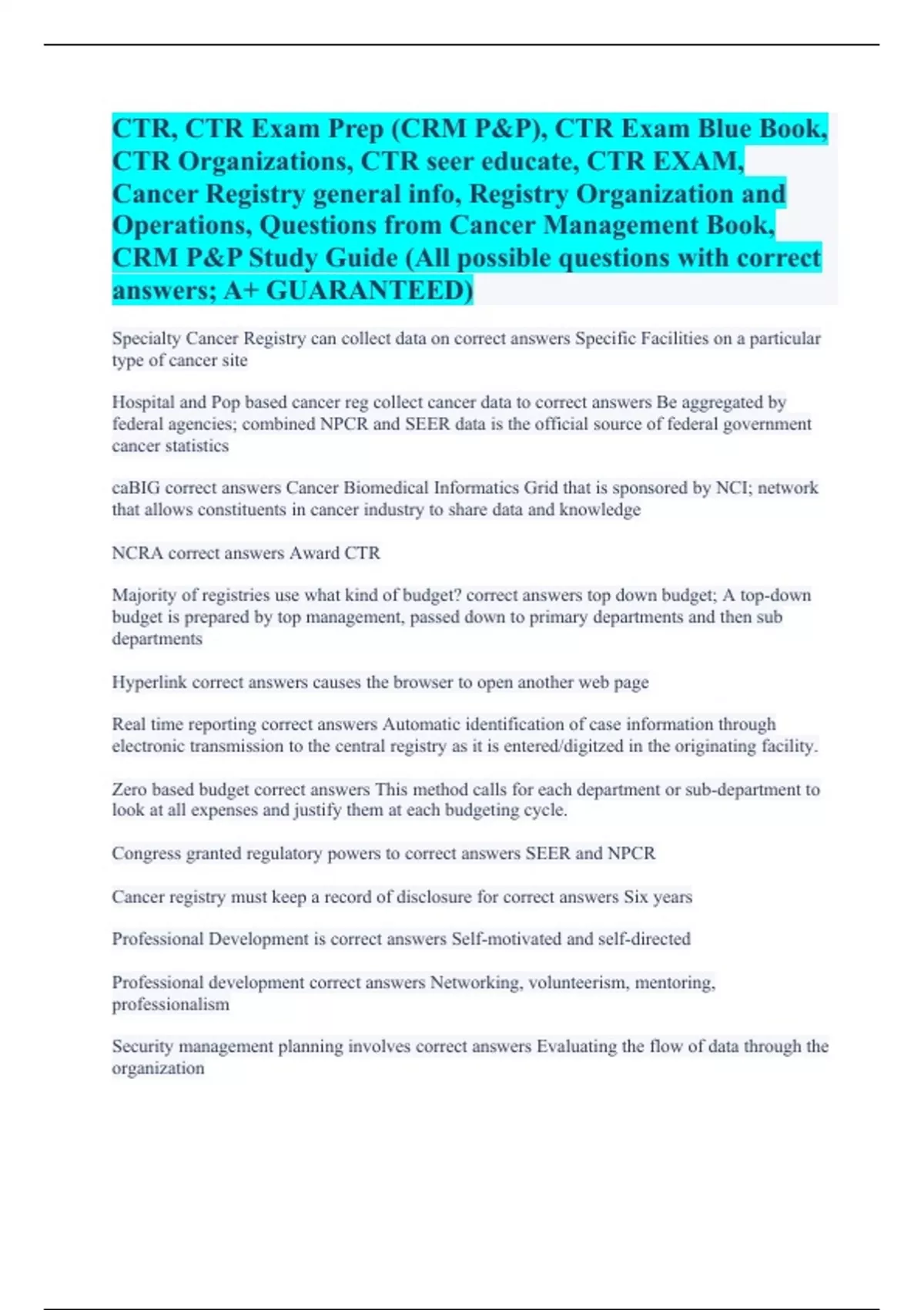 CTR, CTR Exam Prep (CRM P&P), CTR Exam Blue Book, CTR Organizations, CTR seer educate, CTR EXAM, Cancer Registry general info, Registry Organization and Operations, Questions from Cancer Management Book, CRM P&P Study Guide (All possible questions with co