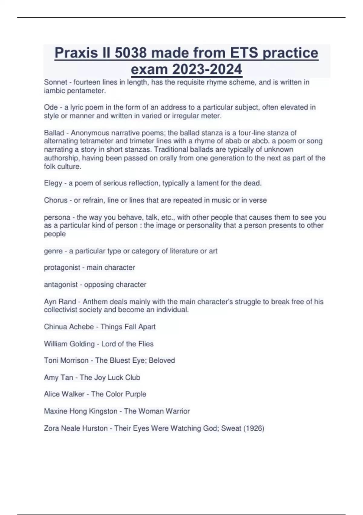 Praxis II 5038 made from ETS practice exam Sonnet - fourteen lines in length, has the requisite rhyme scheme, and is written in iambic pentameter. Ode - a lyric poem in the form of an address to a particular subject, often elevated in style or manner and written in varied or irregular meter. Ballad - Anonymous narrative poems; the ballad stanza is a four-line stanza of alternating tetrameter and trimeter lines with a rhyme of abab or abcb. a poem or song narrating a story in short stanzas. Traditional ballads are typically of unknown authorship, having been passed on orally from one generation to the next as part of the folk culture. Elegy - a poem of serious reflection, typically a lament for the dead. Chorus - or refrain, line or lines that are repeated in music or in verse persona - the way you behave, talk, etc., with other people that causes them to see you as a particular kind of person : the image or personality that a person presents to other people genre - a particular type or category of literature or art protagonist - main character antagonist - opposing character Ayn Rand - Anthem deals mainly with the main character's struggle to break free of his collectivist society and become an individual. Chinua Achebe - Things Fall Apart William Golding - Lord of the Flies Toni Morrison - The Bluest Eye; Beloved Amy Tan - The Joy Luck Club Alice Walker - The Color Purple Maxine Hong Kingston - The Woman Warrior Zora Neale Hurston - Their Eyes Were Watching God; Sweat (1926) Anticipation Guide - a series of questions that students are asked to respond to (usually by marking "Agree" or "Disagree") before a particular unit or lesson is begun. After the unit or lesson, the students review their answers to the anticipation guide and reflect on what they know or understand better. Semantic feature analysis - strategy that uses a grid to help kids explore how sets of things are related to one another. By completing and analyzing the grid, students are able to see connections, make predictions and master important concepts. This strategy enhances comprehension and vocabulary skills. Reciprocal teaching - an instructional activity in which students become the teacher in small group reading sessions. Teachers model, then help students learn to guide group discussions using four strategies: summarizing, question generating, clarifying, and predicting. Background building - the knowledge students have, learned both formally in the classroom as well as informally through life experiences. Classic Haiku - five syllables in the first line, seven in the second, and five in the third. The second line in this poem is short one syllable. Nathaniel Hawthorne - an American novelist, Dark Romantic, and short story writer. Much of Hawthorne's writing centers on New England, many works featuring moral allegories with a Puritan inspiration. His fiction works are considered part of the Romantic movement and, more specifically, Dark romanticism. His themes often center on the inherent evil and sin of humanity, and his works often have moral messages and deep psychological complexity. The House of the Seven Gables, Twice-Told Tales, The Scarlet Letter. Joseph Conrad - wrote stories and novels, many with a nautical setting, that depict trials of the human spirit in the midst of an impassive, inscrutable universe. considered an early modernist, though his works still contain elements of 19th-century realism. His narrative style and anti-heroic characters have influenced many authors, including T. S. Eliot, William Faulkner, Graham Greene, and Salman Rushdie James Fenimore Cooper - The Last of the Mohicans. prolific and popular American writer of the early 19th century. His historical romances of frontier and Indian life in the early American days created a unique form of American literature. Both "Hawkeye" and "Leather-Stocking" were nicknames of Natty Bumppo, the pioneer hero of five novels by James Fenimore Cooper (), known collectively as the Leather-Stocking Tales. Herman Melville - American novelist, short story writer, and poet of the American Renaissance period best known for Typee (1846), a romantic account of his experiences in Polynesian life, and his whaling novel Moby-Dick (1851). He developed a complex, baroque style: the vocabulary is rich and original, a strong sense of rhythm infuses the elaborate sentences, the imagery is often mystical or ironic, and the abundance of allusion extends to Scripture, myth, philosophy, literature, and the visual arts. Dashiell Hammett -...