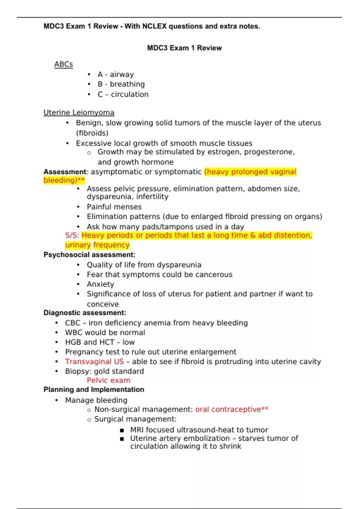MDC3 Exam 1 Review - With NCLEX questions and extra notes.