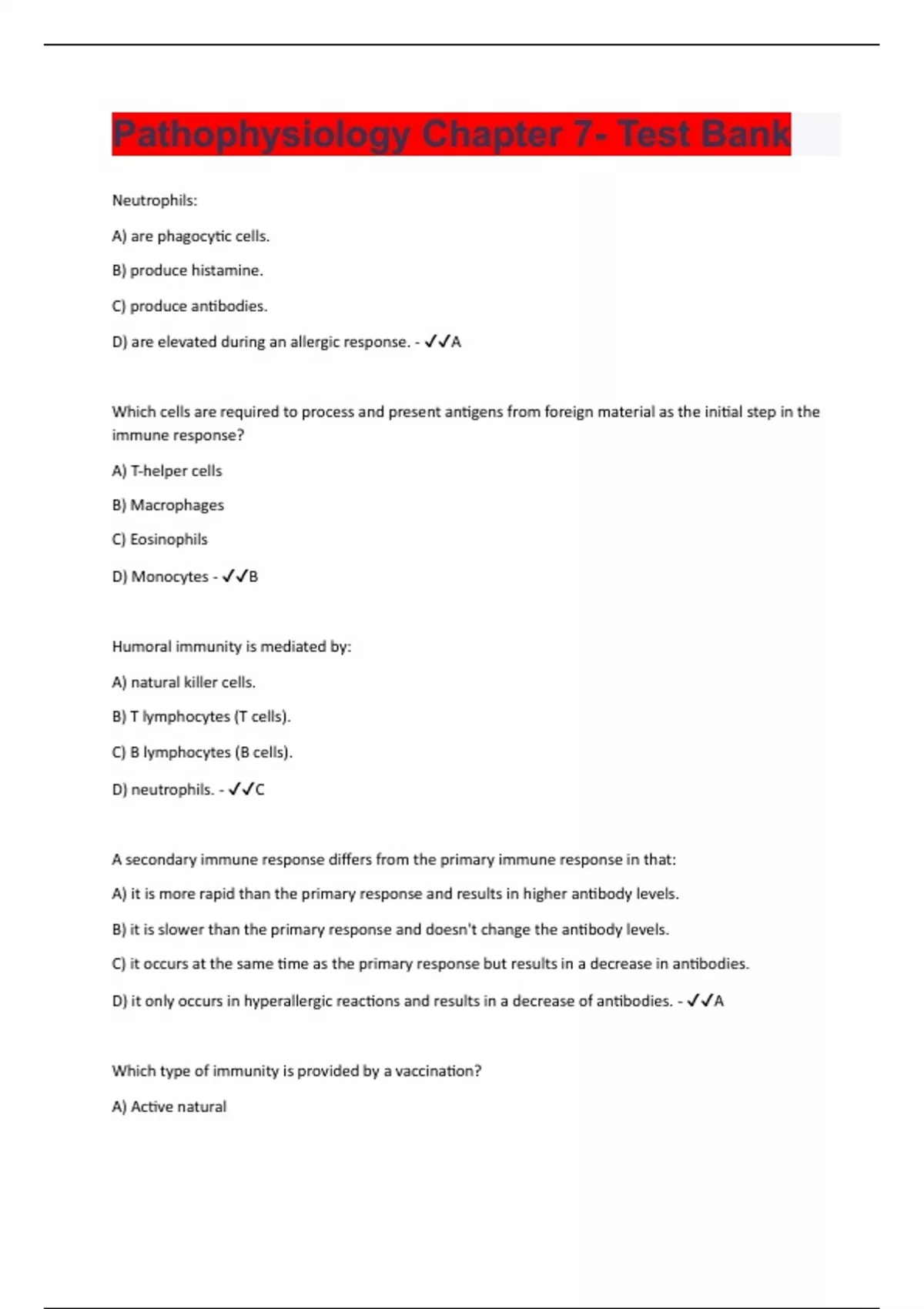 Neutrophils: A) are phagocytic cells. B) produce histamine. C) produce antibodies. D) are elevated during an allergic response. - A Which cells are required to process and present antigens from foreign material as the initial step in the immune response? A) T-helper cells B) Macrophages C) Eosinophils D) Monocytes - B Humoral immunity is mediated by: A) natural killer cells. B) T lymphocytes (T cells). C) B lymphocytes (B cells). D) neutrophils. - C A secondary immune response differs from the primary immune response in that: A) it is more rapid than the primary response and results in higher antibody levels. B) it is slower than the primary response and doesn't change the antibody levels. C) it occurs at the same time as the primary response but results in a decrease in antibodies. D) it only occurs in hyperallergic reactions and results in a decrease of antibodies. - A Which type of immunity is provided by a vaccination? A) Active natural