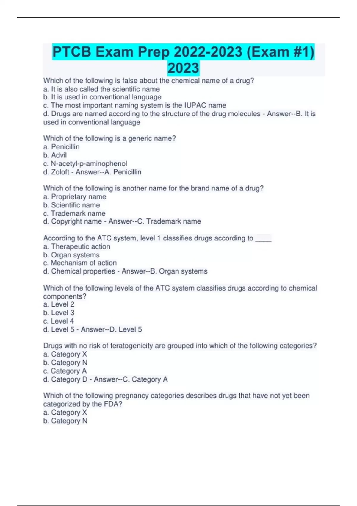 PTCB Exam Prep (Exam #1) 2023 Which of the following is false about the chemical name of a drug? a. It is also called the scientific name b. It is used in conventional language c. The most important naming system is the IUPAC name d. Drugs are named according to the structure of the drug molecules - Answer--B. It is used in conventional language Which of the following is a generic name? a. Penicillin b. Advil c. N-acetyl-p-aminophenol d. Zoloft - Answer--A. Penicillin Which of the following is another name for the brand name of a drug? a. Proprietary name b. Scientific name c. Trademark name d. Copyright name - Answer--C. Trademark name According to the ATC system, level 1 classifies drugs according to ____ a. Therapeutic action b. Organ systems c. Mechanism of action d. Chemical properties - Answer--B. Organ systems Which of the following levels of the ATC system classifies drugs according to chemical components? a. Level 2 b. Level 3 c. Level 4 d. Level 5 - Answer--D. Level 5 Drugs with no risk of teratogenicity are grouped into which of the following categories? a. Category X b. Category N c. Category A d. Category D - Answer--C. Category A Which of the following pregnancy categories describes drugs that have not yet been categorized by the FDA? a. Category X b. Category N c. Category A d. Category D - Answer--B. Category N Continues...