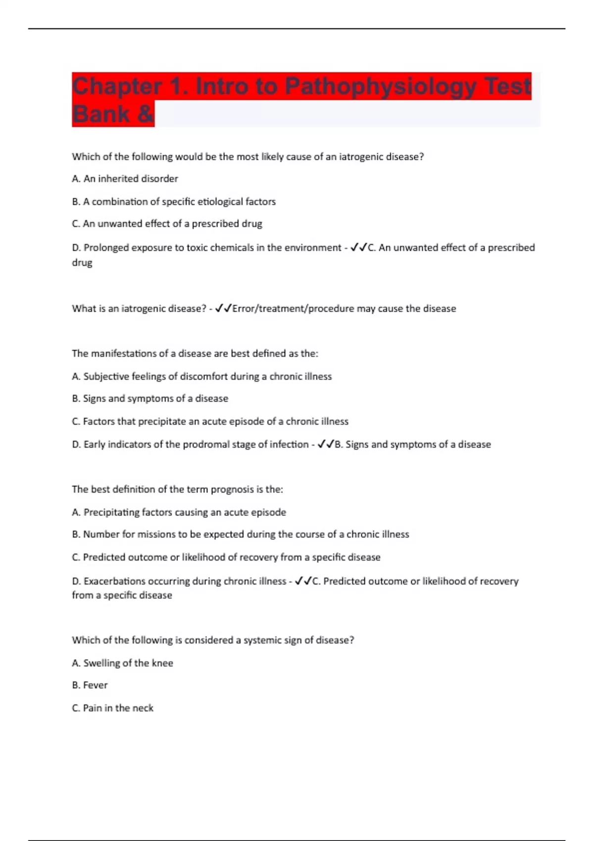 Which of the following would be the most likely cause of an iatrogenic disease? A. An inherited disorder B. A combination of specific etiological factors C. An unwanted effect of a prescribed drug D. Prolonged exposure to toxic chemicals in the environment - C. An unwanted effect of a prescribed drug What is an iatrogenic disease? - Error/treatment/procedure may cause the disease The manifestations of a disease are best defined as the: A. Subjective feelings of discomfort during a chronic illness B. Signs and symptoms of a disease C. Factors that precipitate an acute episode of a chronic illness D. Early indicators of the prodromal stage of infection - B. Signs and symptoms of a disease The best definition of the term prognosis is the: A. Precipitating factors causing an acute episode B. Number for missions to be expected during the course of a chronic illness C. Predicted outcome or likelihood of recovery from a specific disease D. Exacerbations occurring during chronic illness - C. Predicted outcome or likelihood of recovery from a specific disease Which of the following is considered a systemic sign of disease? A. Swelling of the knee B. Fever C. Pain in the neck