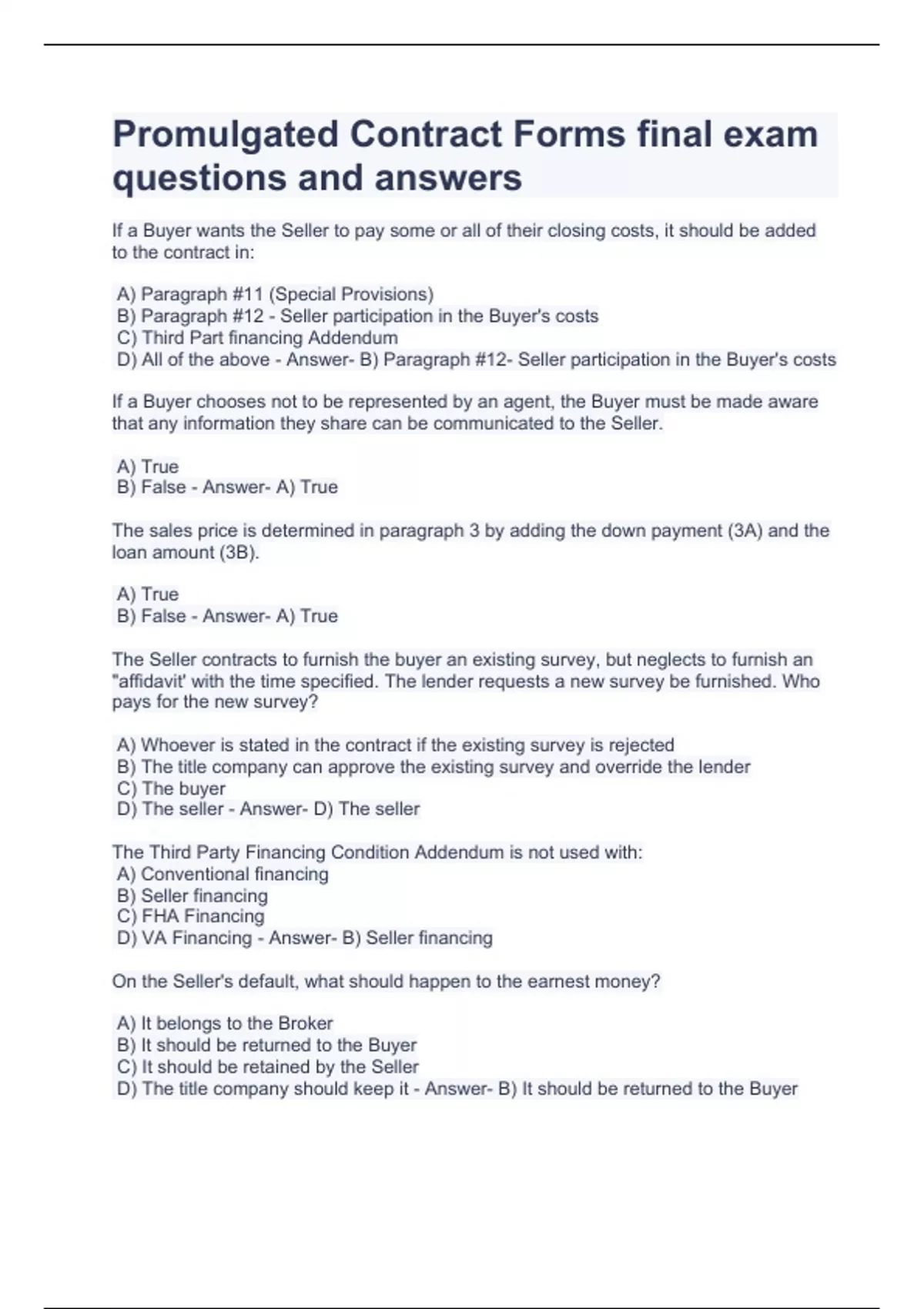 If a Buyer wants the Seller to pay some or all of their closing costs, it should be added to the contract in: A) Paragraph #11 (Special Provisions) B) Paragraph #12 - Seller participation in the Buyer's costs C) Third Part financing Addendum D) All of the above - Answer- B) Paragraph #12- Seller participation in the Buyer's costs If a Buyer chooses not to be represented by an agent, the Buyer must be made aware that any information they share can be communicated to the Seller. A) True B) False - Answer- A) True The sales price is determined in paragraph 3 by adding the down payment (3A) and the loan amount (3B). A) True B) False - Answer- A) True The Seller contracts to furnish the buyer an existing survey, but neglects to furnish an "affidavit' with the time specified. The lender requests a new survey be furnished. Who pays for the new survey? A) Whoever is stated in the contract if the existing survey is rejected B) The title company can approve the existing survey and override the lender C) The buyer D) The seller - Answer- D) The seller The Third Party Financing Condition Addendum is not used with: A) Conventional financing B) Seller financing C) FHA Financing D) VA Financing - Answer- B) Seller financing On the Seller's default, what should happen to the earnest money? A) It belongs to the Broker B) It should be returned to the Buyer C) It should be retained by the Seller D) The title company should keep it - Answer- B) It should be returned to the Buyer If the contract includes an option period for the buyer and the buyer does not tender the option fee to the Seller within the time limit (currently with 3 days from effective date of the contract) the Buyer no longer has an unrestricted right to terminate under the option. A) True B) False - Answer- A) True Fraud is: A) A crime B) A civil law violation C) Both a & b D) Only b - Answer- C) Both a & b When a "fixture" in a property does not remain for the buyer, how do we inform the buyer of that fact and make sure the item does not convey with the property? A) List the item as not included in the listing Agreement B) List the item on the "Seller's Disclosure Notice" C) List the item on the "Residential Contract" D) List the item on the "Amendment" form - Answer- C) List the item on the "Residential Contract" Paragraph 23 "termination option" of the TREC 1-4 Family Residential Contract: A) Binds the seller to complete the repairs needed B) Requires option money that is refundable if the buyer does not buy C) Requires a fee for a specified period of time D) Allows the buyer to get his option fee back if he is disqualified for the loan - Answer- C) Requires a fee for a specified period of time A suit for specific performance is: A) To force the buyer not to default on the contract B) To force the seller not to default on the contract C) To force either the buyer or the seller to perform on the terms of the contract D) Is a lawsuit against the inspection company - Answer- C) To force either the buyer or the seller to perform on the terms of the contract How does the Texas Real Estate License Act define the first face-to-face meeting with required agency disclosure? A) When a licensee first meets a prospect B) When a prospect is ready to sign an agreement C) Only when a specific property is being shown D) When a substantive dialogue about a specific real property occurs - Answer- D) When a substantive dialogue about a specific real property occurs Brokers fees are included in the 1-4 Family Residential Contract (resale) between the Buyer and the Seller. A) True B) False - Answer- B) False Standard forms of TREC must be used unless: A) A broker or salesperson wishes to use a different form B) A principal in the transaction requests a different form to be used C) The listing broker disagrees with certain language in the contract D) A lender requires a different form to be used - Answer- Wrong A) A broker or salesperson wishes to use a different form wrong D) A lender requires a different form to be used According to the TREC 1-4 Residential Contract (Resale), who is responsible for paying the owner policy of title insurance fee? A) The buyer B) The seller C) The title company named in the contract D) The party stipulated in the contract - Answer- D) The party stipulated in the contract The Information About Brokerage Services (IBS) states the broker may represent the: A) Owner B) Buyer C) Both owner and buyer as intermediary D) All of the above - Answer- Wrong C) Both owner and buyer as intermediary What is the status of a contract if the seller does not make the buyer aware of a property being located with a municipal utility district? A) Voidable by the buyer B) Void C) Voidable by the seller D) Voidable by the buyer or the seller - Answer- A) Voidable by the buyer A contract is described as an agreement between two or more parties to do or not do something. A) True B) False - Answer- A) True Any changes to the original contract once it is finalized and receipted must be done: A) At the title company on the original contract B) On an amendment C) On the 3rd Party Financing Addendum D) On a real estate change form - Answer- B) On an amendment A TREC promulgated (declaration)Farm and Ranch contract can include: A) Buildings B) Crops C) Equipment D) All of the above - Answer- D) All of the above What must a Buyer's Representation Agreement have? A) Fair Housing disclosure B) An attachment from a mortgage company regarding buyer's qualifications for a loan C) A termination date D) none of the above - Answer- C) A termination date Who is designated as responsible for promptly sending a copy of the contract to any attorneys that are named in the contract? A) The title company B) The lender C) The broker D) The buyer - Answer- C) The broker According to the Real Estate License Act of Texas, which one of the following actions is a fair and impartial act for an Intermediary? A) Appointing associated licensees to work with the parties B) Appointing