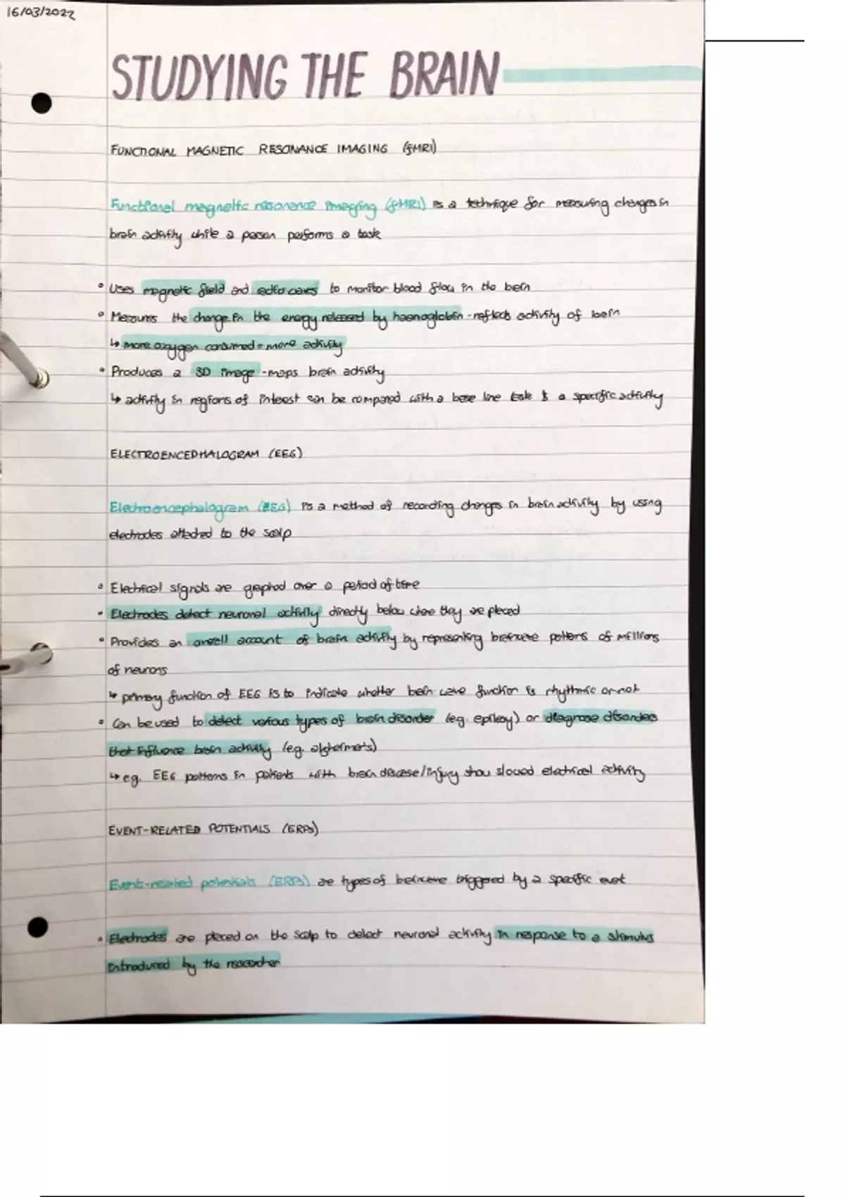 A scanned copy of an A* student's notes on methods of studying the brain from AQA paper 2