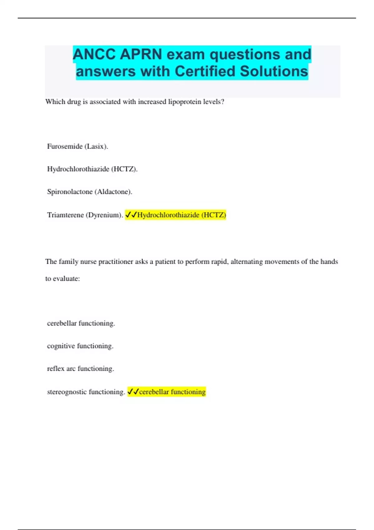 ANCC APRN exam questions and answers with Certified Solutions Which drug is associated with increased lipoprotein levels? Furosemide (Lasix). Hydrochlorothiazide (HCTZ). Spironolactone (Aldactone). Triamterene (Dyrenium). Hydrochlorothiazide (HCTZ) The family nurse practitioner asks a patient to perform rapid, alternating movements of the hands to evaluate: cerebellar functioning. cognitive functioning. reflex arc functioning. stereognostic functioning. cerebellar functioning A 38-year-old patient who is Vietnamese tells the family nurse practitioner that his or her parent died in his or her 40s from liver cancer. The nurse practitioner assesses that the patient is at risk for: hepatitis B. malaria. tularemia. tyrosinemia hepatitis B. A 55-year-old male patient who is Chinese has a follow-up appointment after cardiac bypass surgery. The patient brings his father with him into the examination room. The family nurse practitioner provides culturally sensitive care by: asking the patient's father if he has any questions regarding his son's care. asking the patient's father to leave the room due to confidentiality issues. performing the examination without commenting to the patient's father. performing the examination, then telling the patient's father the examination findings. asking the patient's father if he has any questions regarding his son's care. A difficult aspect of determining occupational exposure to disease is the: confidentiality of the information within company records. inaccuracy of occupational disease reporting. long latency period between exposure and disease development. reliance on workers' memories. long latency period between exposure and disease development. The family nurse practitioner exhibits professional leadership by: adding clinical protocols to the nurse practitioner scope of practice. comparing the workplace roles of the registered nurse and the nurse practitioner. creating a task force to address scope-of-practice concerns. lobbying to eliminate continuing education requirements. creating a task force to address scope-of-practice concerns. To comply with regulations for third-party payor reimbursement and documentation, a family nurse practitioner correlates: