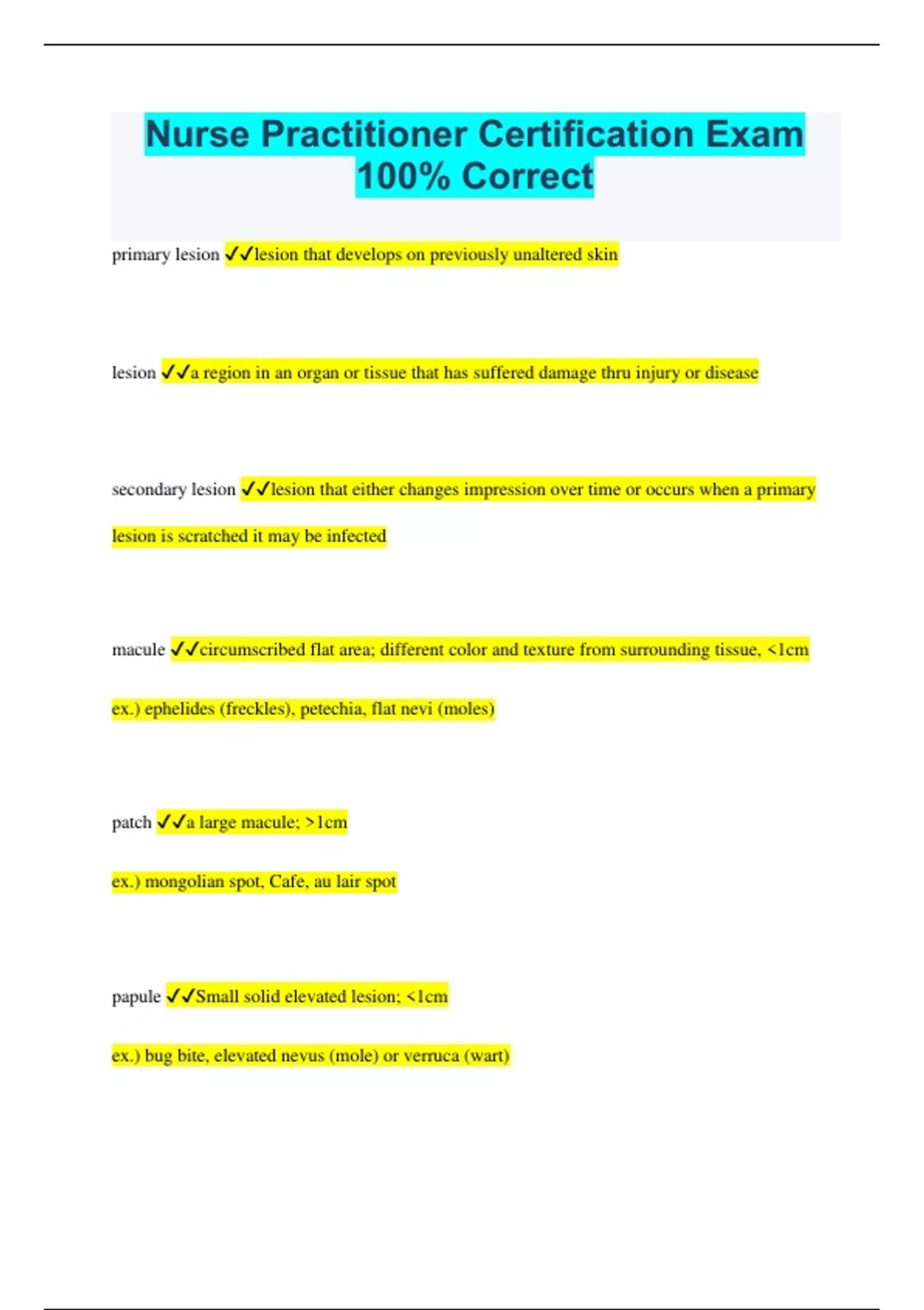 Nurse Practitioner Certification Exam 100% Correct primary lesion lesion that develops on previously unaltered skin lesion a region in an organ or tissue that has suffered damage thru injury or disease secondary lesion lesion that either changes impression over time or occurs when a primary lesion is scratched it may be infected macule circumscribed flat area; different color and texture from surrounding tissue, <1cm ex.) ephelides (freckles), petechia, flat nevi (moles) patch a large macule; >1cm ex.) mongolian spot, Cafe, au lair spot papule Small solid elevated lesion; <1cm ex.) bug bite, elevated nevus (mole) or verruca (wart) plaque elevation of skin; >1cm; example psoriasis lesion pustule a visible accumulation of purulent fluid under skin; <1cm; examples acne and impetigo vesicle a circumscribed elevation of skin contains "SEROUS FLUID: <1cm; examples, herpes simples, varicella, shingles nodule solid mass of skin, is elevated or palpated >1cm; often extends deeper into dermis: examples xanthoma and fibroma bulla blister, circumscribed elevation containing fluid >1cm , extends only into epidermis, examples burns, superficial blister, contact dermatitis wheal elevated white or pink compressible papule or plaque, a red, axon-mediated flare often surround it, commonly associated with allergic reaction, examples PPD test and mosquito bites cyst any closed cavity or sac; contains fluid or semisolid material, normal or abnormal epithelium. example sebaceous cyst Abscess a localized collection of purulent fluid in a cavity formed by disintegration or necrosis of tissues >1cm tumor "MASS: > few cm in diameter; firm or soft; benign or malignant configuration: annular circular, begins in center and spreads to p