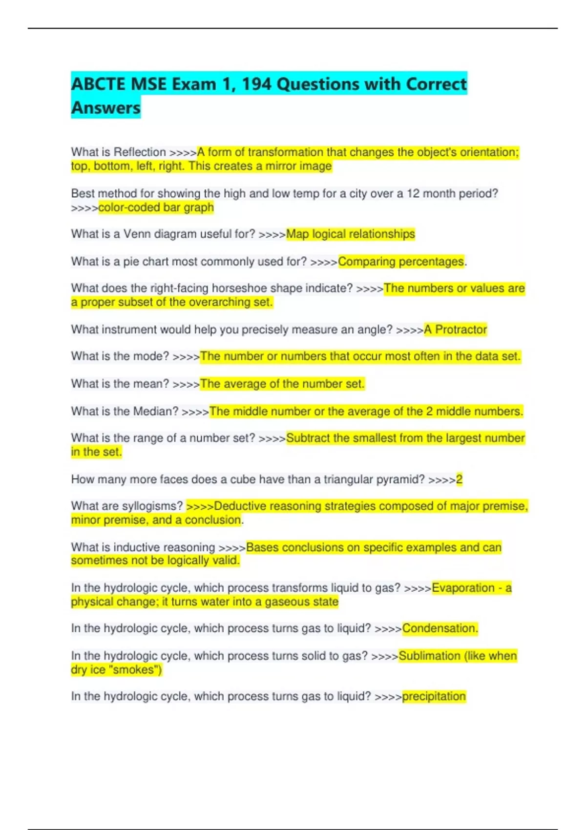 ABCTE MSE Exam 1, 194 Questions with Correct Answers What is Reflection >>>>A form of transformation that changes the object's orientation; top, bottom, left, right. This creates a mirror image Best method for showing the high and low temp for a city over a 12 month period? >>>>color-coded bar graph What is a Venn diagram useful for? >>>>Map logical relationships What is a pie chart most commonly used for? >>>>Comparing percentages. What does the right-facing horseshoe shape indicate? >>>>The numbers or values are a proper subset of the overarching set. What instrument would help you precisely measure an angle? >>>>A Protractor What is the mode? >>>>The number or numbers that occur most often in the data set. What is the mean? >>>>The average of the number set. What is the Median? >>>>The middle number or the average of the 2 middle numbers. What is the range of a number set? >>>>Subtract the smallest from the largest number in the set. How many more faces does a cube have than a triangular pyramid? >>>>2 What are syllogisms? >>>>Deductive reasoning strategies composed of major premise, minor premise, and a conclusion. What is inductive reasoning >>>>Bases conclusions on specific examples and can sometimes not be logically valid. In the hydrologic cycle, which process transforms liquid to gas? >>>>Evaporation - a physical change; it turns water into a gaseous state In the hydrologic cycle, which process turns gas to liquid? >>>>Condensation. In the hydrologic cycle, which process turns solid to gas? >>>>Sublimation (like when dry ice "smokes") In the hydrologic cycle, which process turns gas to liquid? >>>>precipitation What is climate? >>>>The overall weather pattern over time in a certain region. What does "biotic" mean? >>>>the living elements in a biome - plants, mammals, insects What does abiotic mean? >>>>non-living element in a biome - pond, rain, sunlight. What is the purpose of the scientific method? >>>>To use observation to test hypotheses and make predictions. What is the scientific method based on? >>>>observation and the replication of results; hypotheses are formed and tested, with the hope that a theory can be created from the cycle of tested hypotheses. According to Darwin's idea of natural selection... >>>>Populations pass down traits that help them adapt to their environment. 19th century scientist George Mendel believed that... >>>>The emergence of one trait will not affect the emergence of another. How many planets in our solar system are known to have rings? >>>>4 - Jupiter, Saturn, Uranus and Neptune Give an example of the rain shadow effect: >>>>A town on the leeward side of the mountain receives little annual rainfall. Leeward side >>>>Side of the mountain protected from the wind. What is the rain shadow effect? >>>>Mountains push moist air to higher altitudes where it cools, and water vapor condenses to form rain or snow that only falls on the windward side. Can the gemstone sapphire be scratched by quartz? Why? >>>>No, because it is a variety of corundum, which ranks a very high 9 on the Mohs scale of mineral hardness. Quartz is a 7 on the scale. Where is lignite on the Mohs scale of hardness? >>>>It is a very soft form of coal, so it is low. Where is talc on the Mohs scale of hardness? >>>>It is a 1; it can be scratched with your fingernail. The liver is an organ in the ____________ system? >>>>Digestive. The liver provides bile and other enzymes for the digestion of dietary fats. What are the rectus abdominus? >>>>Muscles of the torso. Where is the pituitary gland located, and what does it do? >>>>It is located in the brain and it secretes a variety of hormones. Intense heat and pressure transform limestone into what? >>>>Marble. What kind of rock is limestone? >>>>Sedimentary rock. Anthracite is a form of what? >>>>Coal. What is formica? >>>>A man-made materiel invented in 1913. What is halite? >>>>rock salt Would xenon be a good choice to fill a balloon with? >>>>It wouldn't hurt anything, but xenon is heavier than air. What gas would be dangerous to fill a balloon with? >>>>Hydrogen. It is highly reactive. Would nitrogen be a good choice to fill a balloon with? >>>>It wouldn't hurt anything but it would approximate the weight of air and look like a "tired" helium balloon. Neutrals have a pH value of >>>>greater than 7 to 14 If a substance is corrosive to metal and turns litmus paper red, it is _________ >>>>an acid. Acids have characteristics of being sour, like lemon juice and vinegar. If a substance feels slippery and turns litmus paper blue it is ________ >>>>a base. Examples are baking soda and ammonia. Acids have a pH value of >>>>0 - 6 Battery acid is at 0. what features are only found in plant cells? >>>>cell wall and chloroplasts. Neutrals have a pH value of >>>>zero. water, for example. Animal cells have _____ instead of cell walls? >>>>cell membranes Why don't animal cells need chloroplasts for photosynthesis? >>>>Because animals do not get their energy from light. What factor would hinder the normal development of a plant? >>>>Stress - from things like soil conditions and restricted growing space would stunt plant growth. What was Darwin's major contribution to the scientific world? >>>>Natural Selection (along with Alfred Russell Wallace) What was Linnaeus' major contribution to the scientific world? >>>>Taxonomic classification (he was an 18th century Swedish scientist) He laid the foundation for our hierarchical scheme for classifying plants and animals. What was Mendeleev's major contribution to Science? >>>>He devised an early version of the periodic table. What was Mendel's scientific contribution? >>>>He was a forefather in the field of genetics. What is the proper sequence in the water cycle? >>>>Evaporation, condensation, precipitation, collection. which instrument would be useful in studying weather? >>>>Anemometer Which instrument would be useful in measuring wind speed? >>>>Anemometer Which instrument would be useful in measuring blo