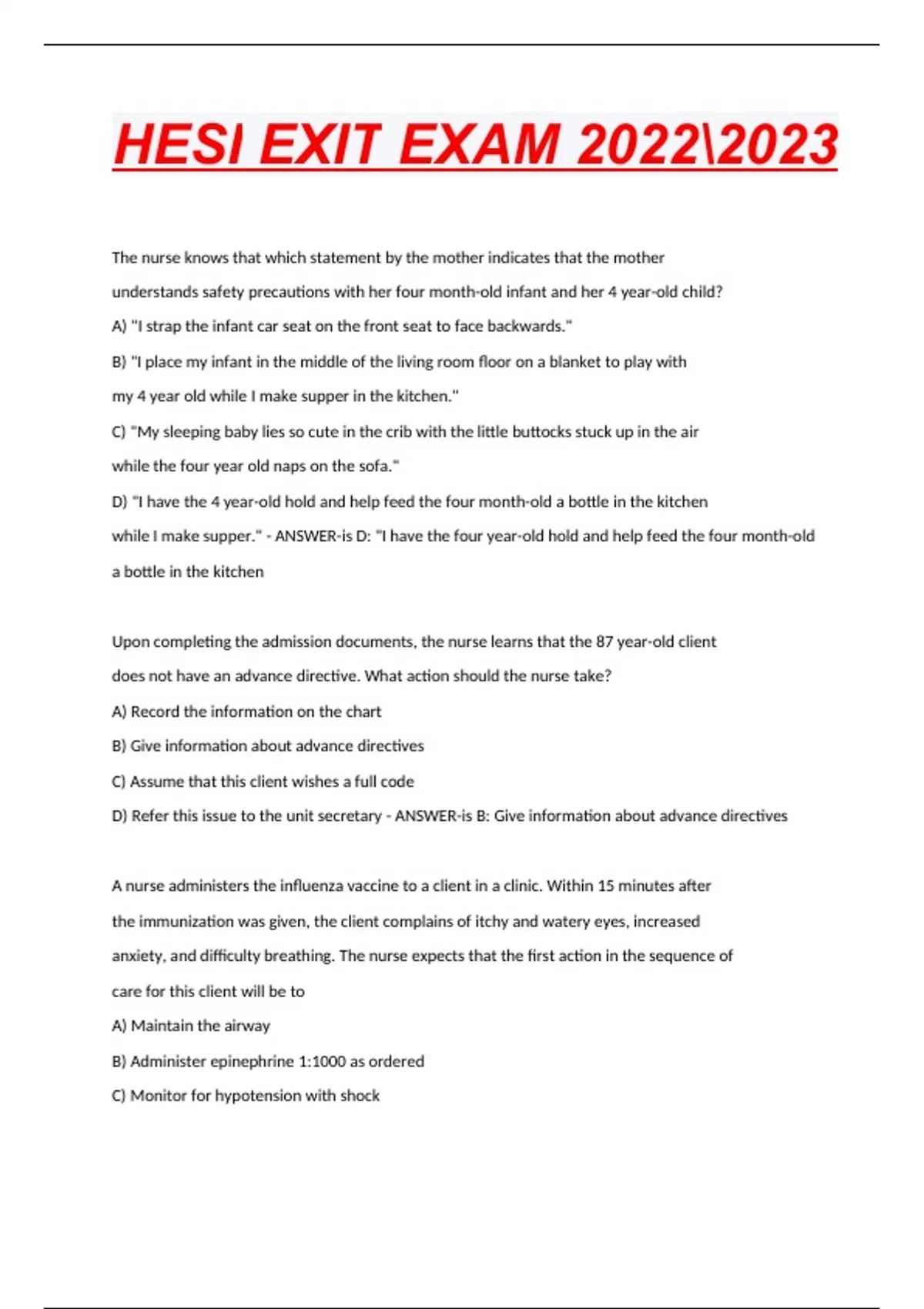 Which of these children at the site of a disaster at a child day care center would the triage nurse put in the "treat last" category? A) An infant with intermittent bulging anterior fontanel between crying episodes B) A toddler with severe deep abrasions over 98% of the body C) A preschooler with 1 lower leg fracture and the other leg with an upper leg fracture D) A school-age child with singed eyebrows and hair on the arms - ANSWER-is B: A toddler with severe deep abrasions over 98% of the body . When admitting a client to an acute care facility, an identification bracelet is sent up with the admission form. In the event these do not match, the nurse's best action is to A) Change whichever item is incorrect to the correct information B) Use the bracelet and admission form until a replacement is supplied C) Notify the admissions office and wait to apply the bracelet D) Make a corrected identification bracelet for the client - ANSWER-is C: notify the admissions office and wait to apply the bracelet The nurse is having difficulty reading the health care provider's written order that was written right before the shift change. What action should be taken? A) Leave the order for the oncoming staff to follow-up B) Contact the charge nurse for an interpretation C) Ask the pharmacy for assistance in the interpretation D) Call the provider for clarification - ANSWER-is D: Call the provider for clarification An adult client is found to be unresponsive on morning rounds. After checking for responsiveness and calling for help, the next action that should be taken by the nurse is to: A) check the carotid pulse B) deliver 5 abdominal thrusts C) give 2 rescue breaths D) open the client's airway - ANSWER-is D: open the client''s airway A client has an order for 1000 ml of D5W over an 8 hour period. The nurse discovers that 800 ml has been infused after 4 hours. What is the priority nursing action? A) Ask the client if there are any breathing problems B) Have the client void as much as possible C) Check the vital signs D) Auscultate the lungs - ANSWER-is D: Auscultate the lungs Following change-of-shift report on an orthopedic unit, which client should the nurse see first? A) 16 year-old who had an open reduction of a fractured wrist 10 hours ago B) 20 year-old in skeletal traction for 2 weeks since a motor cycle accident C) 72 year-old recovering from surgery after a hip replacement 2 hours ago D) 75 year-old who is in skin traction prior to planned hip pinning surgery. - ANSWER-is C: 72 year-old recovering from surgery after a hip replacement 2 hours ago 1 A nurse observes a family member administer a rectal suppository by having the client lie on the left side for the administration. The family member pushed the suppository until the finger went up to the second knuckle. After 10 minutes the client was told by the family member to turn to the right side and the client did this. What is the appropriate comment for the nurse to make? A) Why don't we now have the client turn back to the left side. B) That was done correctly. Did you have any problems with the insertion? C) Let's check to see if the suppository is in far enough. D) Did you feel any stool in the intestinal tract? - ANSWER-is B: That was done correctly. Did you have any problems with the insertion? 1 A client with a diagnosis of Methicillin resistant Staphylococcus aureus (MRSA) has died. Which type of precautions is the appropriate type to use when performing postmortem care? A) airborne precautions B) droplet precautions C) contact precautions D) compromised host precautions - ANSWER-is C: contact precautions 1 The nurse is reviewing with a client how to collect a clean catch urine specimen. Which sequence is appropriate teaching? A) Void a little, clean the meatus, then collect specimen B) clean the meatus, begin voiding, then catch urine stream C) Clean the meatus, then urinate into container D) Void continuously and catch some of the urine - ANSWER-is B: clean the meatus, begin voiding, then catch urine stream 1 The provider orders Lanoxin (digoxin) 125 mg PO and furosomide 40 mg every day. Which of these foods would the nurse reinforce for the client to eat at least daily? A) spaghetti B) watermelon C) chicken D) tomatoes - ANSWER-is B: watermelon 1 A nurse is stuck in the hand by an exposed needle. What immediate action should the nurse take? A) Look up the policy on needle sticks B) Contact employee health services C) Immediately wash the hands with vigor D) Notify the supervisor and risk management - ANSWER-is C: Immediately wash the hands with vigor 1 As the nurse observes the student nurse during the administration of a narcotic analgesic IM injection, the nurse notes that the student begins to give the medication without first aspirating. What should the nurse do? A) Ask the student: "What did you forget to do?" B) Stop. Tell me why aspiration is needed. C) Loudly state: "You forgot to aspirate." D) Walk up and whisper in the student's ear "Stop. Aspirate. Then inject." - ANSWER-is D: Walk up and whisper in the student's ear "Stop. Aspirate. Then inject." 1 A client with Guillain Barre is in a non responsive state, yet vital signs are stable and breathing is independent. What should the nurse document to most accurately describe the client's condition? A) Comatose, breathing unlabored B) Glascow Coma Scale 8, respirations regular C) Appears to be sleeping, vital signs stable D) Glascow Coma Scale 13, no ventilator required - ANSWER-is B: Glascow Coma Scale 8, respirations regular 1 A client enters the emergency department unconscious via ambulance from the client's work place. What document should be given priority to guide the direction of care for this client? A) The statement of client rights and the client self determination act B) Orders written by the health care provider C) A notarized original of advance directives brought in by the partner D) The clinical pathway protocol of the agency and the emergency department - ANS
