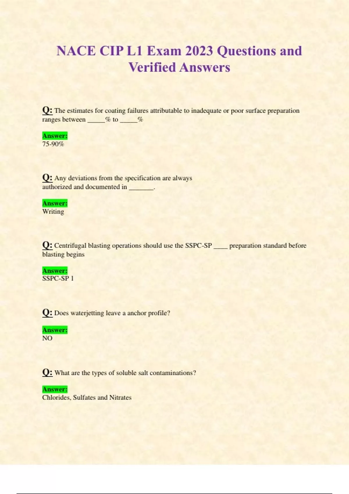 NACE CIP L1 Exam 2023 Questions and Verified Answers Q: The estimates for coating failures attributable to inadequate or poor surface preparation ranges between _____% to _____% Answer: 75-90% Q: Any deviations from the specification are always authorized and documented in _______. Answer: Writing Q: Centrifugal blasting operations should use the SSPC-SP ____ preparation standard before blasting begins Answer: SSPC-SP 1 Q: Does waterjetting leave a anchor profile? Answer: NO Q: What are the types of soluble salt contaminations? Answer: Chlorides, Sulfates and Nitrates Q: True or false: a corrosion cell can remain active on a substrate after the coating is applied and lead to premature coating failures Answer: TRUE Q: Potassium Ferricyanide testing for water-soluble ferrous salts turns what color when it indicates the presence of soluble salts? Answer: Dark Blue Q: Bresle Patch Test - The syringe needle needs to be applied through what part of the patch? Answer: Spongy foam perimeter Q: The CSN test kit tests for what chemicals? Answer: Chlorides, sulfates and nitrates Q: How long should you massage the test solution against the surface through the test sleeve during a test sleeve test? Answer: 2 minutes Q: Visual tools - the two types of comparators are? Answer: Type G - Grit abrasives Type S - Shot abrasives Q: The comparator visual test tool panels only show how many sides? Answer: 3 - Fine, medium and coarse Q: is supervision considered to be part of the coating inspectors role? Answer: NO Q: Can the coating inspector make changes to the specification? Answer: NO Q: The maximum surface temp. for coating application is ____F. Answer: 125F. Q: The minimum surface temp. for coating application is ____F. Answer: 40F. Q: All organic coatings contain ____? Answer: Carbon