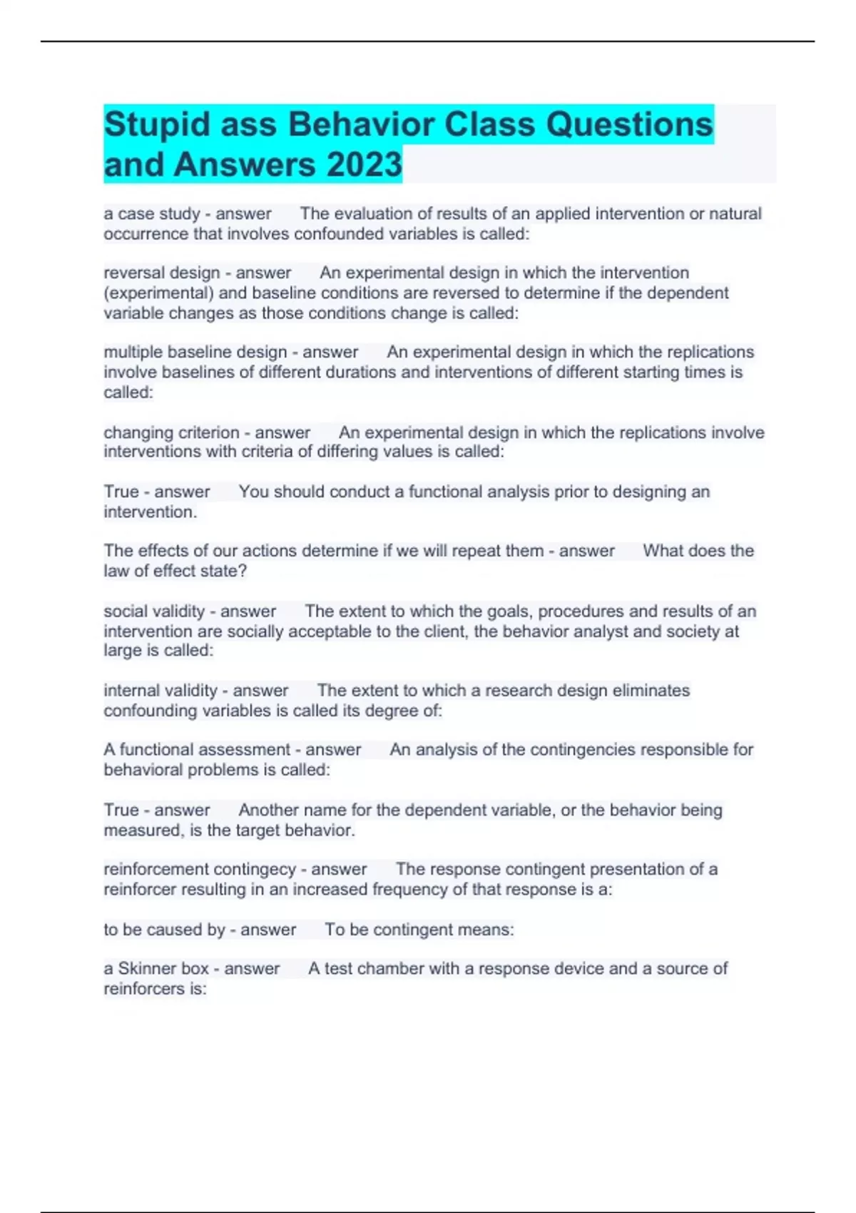 Stupid ass Behavior Class Questions and Answers 2023 a case study The evaluation of results of an applied intervention or natural occurrence that involves confounded variables is called: reversal design An experimental design in which the intervention (experimental) and baseline conditions are reversed to determine if the dependent variable changes as those conditions change is called: multiple baseline design An experimental design in which the replications involve baselines of different durations and interventions of different starting times is called: changing criterion An experimental design in which the replications involve interventions with criteria of differing values is called: True You should conduct a functional analysis prior to designing an intervention. The effects of our actions determine if we will repeat them What does the law of effect state? social validity The extent to which the goals, procedures and results of an intervention are socially acceptable to the client, the behavior analyst and society at large is called: internal validity The extent to which a research design eliminates confounding variables is called its degree of: A functional assessment An analysis of the contingencies responsible for behavioral problems is called: True Another name for the dependent variable, or the behavior being measured, is the target behavior. reinforcement contingecy The response contingent presentation of a reinforcer resulting in an increased frequency of that response is a: to be caused by To be contingent means: a Skinner box A test chamber with a response device and a source of reinforcers is: circular reasoning What's the name for the kind of reasoning involved with terms like want? Bribe The use of a reinforcer, often (but not always) given in advance, for the performance of an illegal or immoral act. False The effects of reinforcement and punishment contingencies increase as the delay between the response and the outcome increases. a behavioral contingency ` The occasion for a response, the response and the outcome of the response is called: the error of reification To call a behavior or process a thing is: True Reinforcer behavior, not people. medical model myth Behavior is viewed as a symptom of an underlying psychological condition. the shock Which of the following is a negative reinforcer in a Skinner box experiment? abnormal behavior flows out of sick people like toothpaste squeezed from a tube; the abnormal behavior results from inner pressure The toothpaste theory of behavior states: A stimulus that increases the future frequency of a response that its removal or termination follows An aversive stimulus is: Who is the most famous real psychologist in the world? Skinner