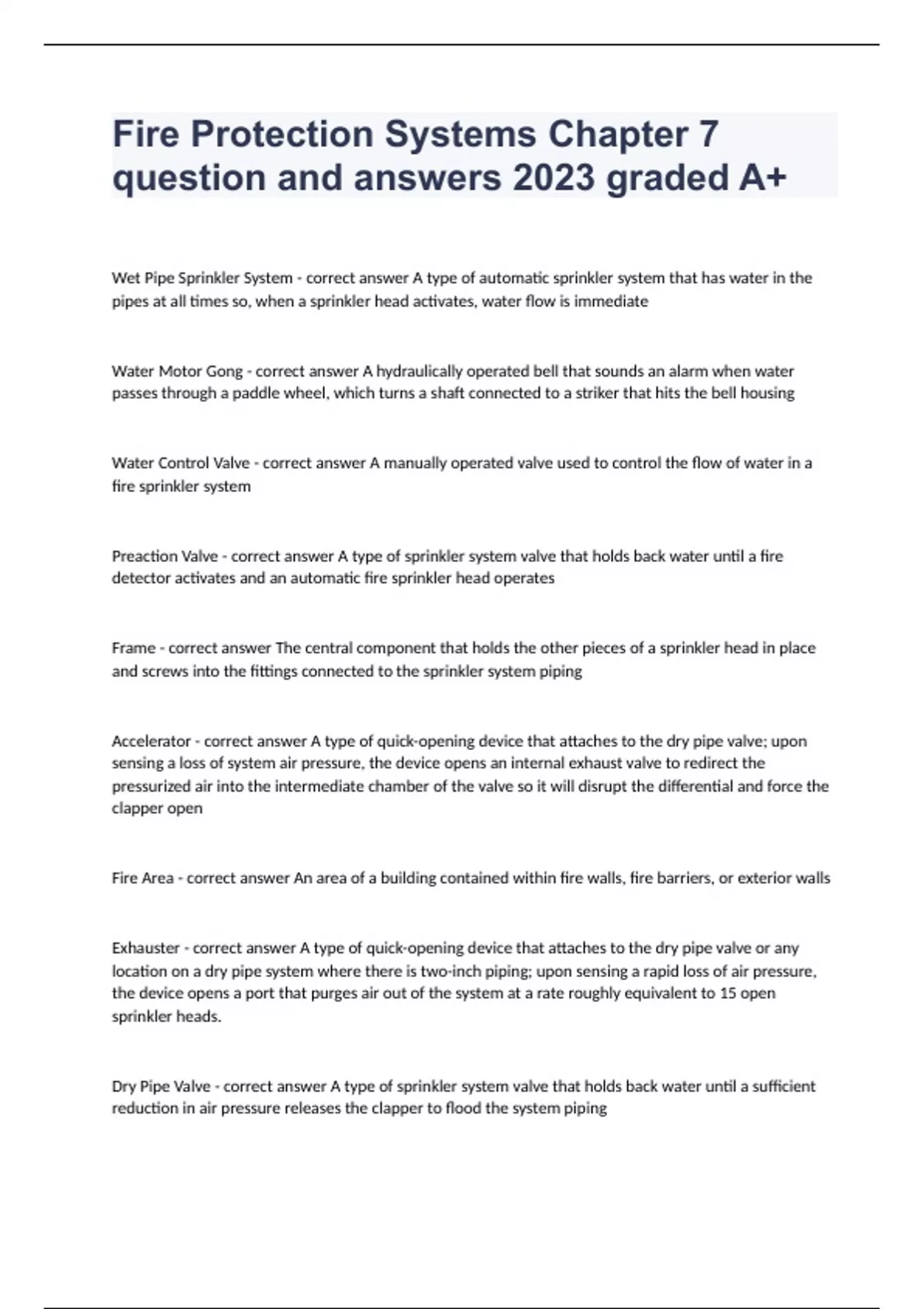 Fire Protection Systems Chapter 7 question and answers 2023 graded A+ Wet Pipe Sprinkler System - correct answer A type of automatic sprinkler system that has water in the pipes at all times so, when a sprinkler head activates, water flow is immediate Water Motor Gong - correct answer A hydraulically operated bell that sounds an alarm when water passes through a paddle wheel, which turns a shaft connected to a striker that hits the bell housing Water Control Valve - correct answer A manually operated valve used to control the flow of water in a fire sprinkler system Preaction Valve - correct answer A type of sprinkler system valve that holds back water until a fire detector activates and an automatic fire sprinkler head operates Frame - correct answer The central component that holds the other pieces of a sprinkler head in place and screws into the fittings connected to the sprinkler system piping Accelerator - correct answer A type of quick-opening device that attaches to the dry pipe valve; upon sensing a loss of system air pressure, the device opens an internal exhaust valve to redirect the pressurized air into the intermediate chamber of the valve so it will disrupt the differential and force the clapper open Fire Area - correct answer An area of a building contained within fire walls, fire barriers, or exterior walls Exhauster - correct answer A type of quick-opening device that attaches to the dry pipe valve or any location on a dry pipe system where there is two-inch piping; upon sensing a rapid loss of air pressure, the device opens a port that purges air out of the system at a rate roughly equivalent to 15 open sprinkler heads. Dry Pipe Valve - correct answer A type of sprinkler system valve that holds back water until a sufficient reduction in air pressure releases the clapper to flood the system piping