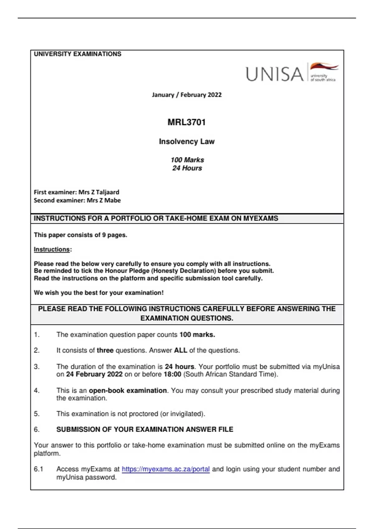 3. The duration of the examination is 24 hours. Your portfolio must be submitted via myUnisa