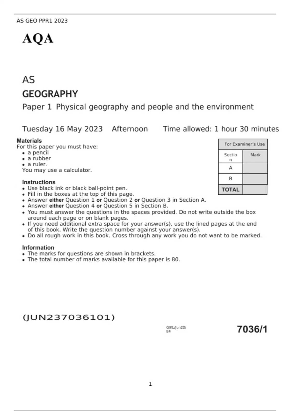AQA AS GEOGRAPHY Paper 1 Physical geography and people and the environment May 2023