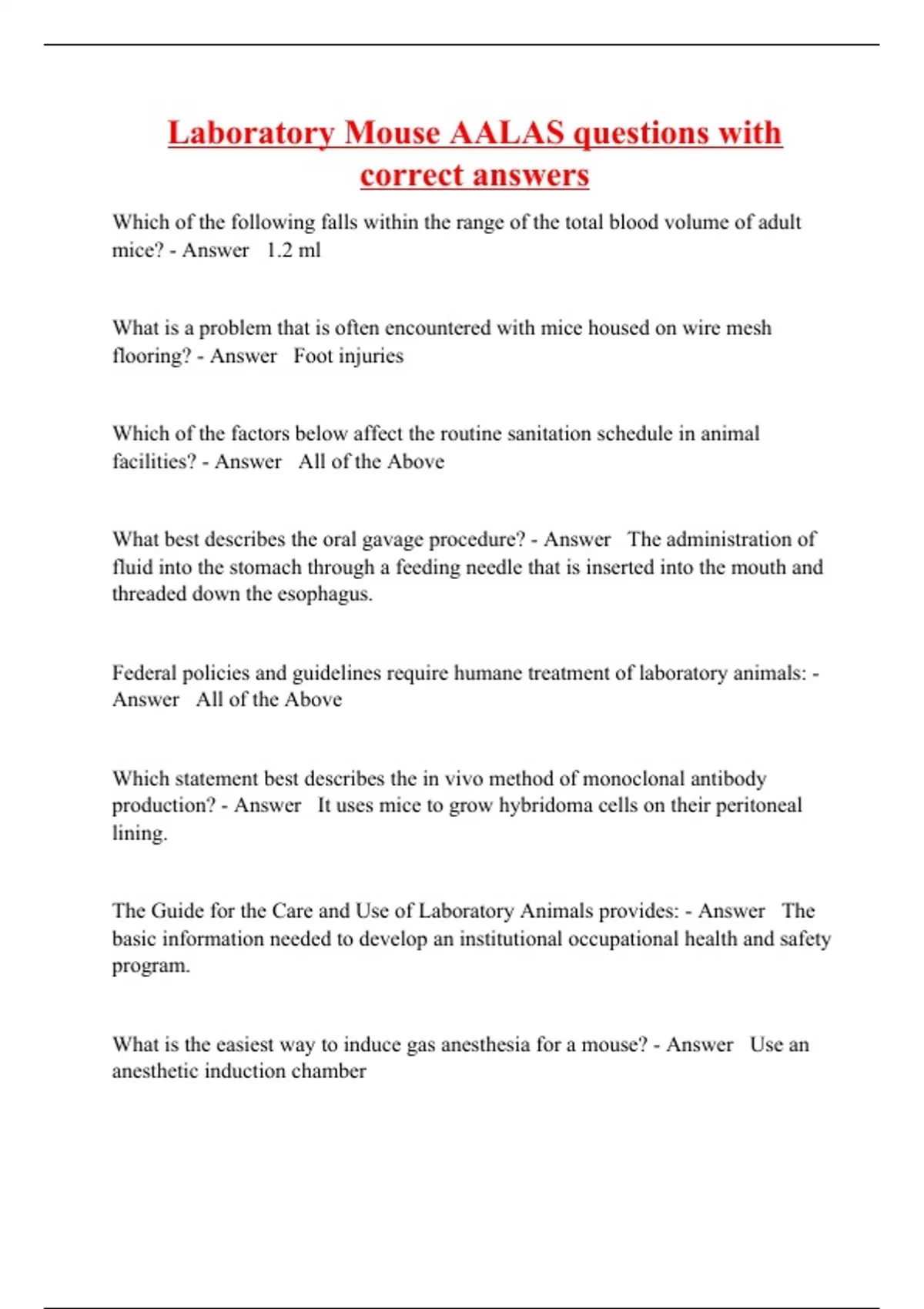 Which of the following falls within the range of the total blood volume of adult mice? - Answer 1.2 ml What is a problem that is often encountered with mice housed on wire mesh flooring? - Answer Foot injuries Which of the factors below affect the routine sanitation schedule in animal facilities? - Answer All of the Above What best describes the oral gavage procedure? - Answer The administration of fluid into the stomach through a feeding needle that is inserted into the mouth and threaded down the esophagus. Federal policies and guidelines require humane treatment of laboratory animals: - Answer All of the Above Which statement best describes the in vivo method of monoclonal antibody production? - Answer It uses mice to grow hybridoma cells on their peritoneal lining.