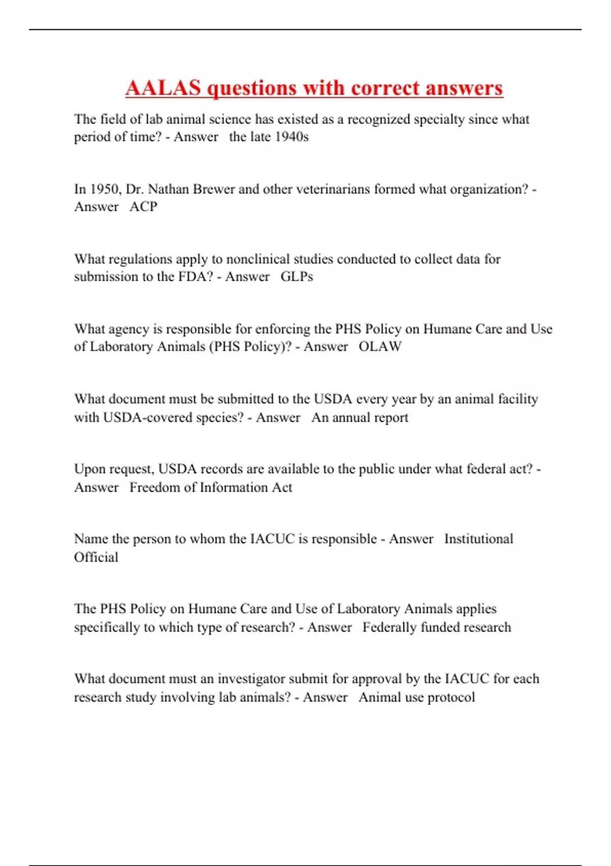 The field of lab animal science has existed as a recognized specialty since what period of time? - Answer the late 1940s In 1950, Dr. Nathan Brewer and other veterinarians formed what organization? - Answer ACP What regulations apply to nonclinical studies conducted to collect data for submission to the FDA? - Answer GLPs What agency is responsible for enforcing the PHS Policy on Humane Care and Use of Laboratory Animals (PHS Policy)? - Answer OLAW What document must be submitted to the USDA every year by an animal facility with USDA-covered species? - Answer An annual report Upon request, USDA records are available to the public under what federal act? - Answer Freedom of Information Act Name the person to whom the IACUC is responsible - Answer Institutional Official The PHS Policy on Humane Care and Use of Laboratory Animals applies specifically to which type of research? - Answer Federally funded research What document must an investigator submit for approval by the IACUC for each research study involving lab animals? - Answer Animal use protocol