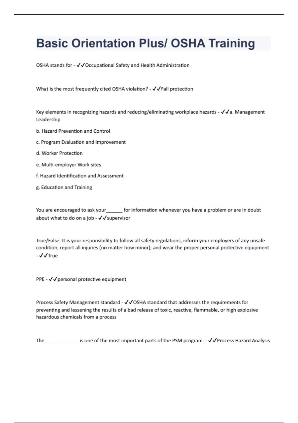 OSHA stands for - Occupational Safety and Health Administration What is the most frequently cited OSHA violation? - Fall protection Key elements in recognizing hazards and reducing/eliminating workplace hazards - a. Management Leadership b. Hazard Prevention and Control c. Program Evaluation and Improvement d. Worker Protection e. Multi-employer Work sites f. Hazard Identification and Assessment g. Education and Training You are encouraged to ask your______ for information whenever you have a problem or are in doubt about what to do on a job - supervisor True/False: It is your responsibility to follow all safety regulations, inform your employers of any unsafe condition; report all injuries (no matter how minor); and wear the proper personal protective equipment - True PPE - personal protective equipment Process Safety Management standard - OSHA standard that addresses the requirements for preventing and lessening the results of a bad release of toxic, reactive, flammable, or high explosive hazardous chemicals from a process The ____________ is one of the most important parts of the PSM program. - Process Hazard Analysis