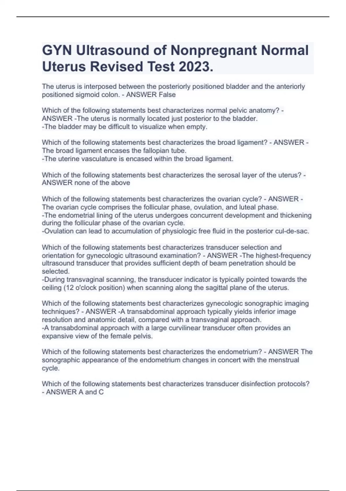 GYN Ultrasound of Nonpregnant Normal Uterus Revised Test 2023.The uterus is interposed between the posteriorly positioned bladder and the anteriorly positioned sigmoid colon. - ANSWER False Which of the following statements best characterizes normal pelvic anatomy? - ANSWER -The uterus is normally located just posterior to the bladder. -The bladder may be difficult to visualize when empty. Which of the following statements best characterizes the broad ligament? - ANSWER -The broad ligament encases the fallopian tube. -The uterine vasculature is encased within the broad ligament. Which of the following statements best characterizes the serosal layer of the uterus? - ANSWER none of the above Which of the following statements best characterizes the ovarian cycle? - ANSWER -The ovarian cycle comprises the follicular phase, ovulation, and luteal phase. -The endometrial lining of the uterus undergoes concurrent development and thickening during the follicular phase of the ovarian cycle. -Ovulation can lead to accumulation of physiologic free fluid in the posterior cul-de-sac. Which of the following statements best characterizes transducer selection and orientation for gynecologic ultrasound examination? - ANSWER -The highest-frequency ultrasound transducer that provides sufficient depth of beam penetration should be selected. -During transvaginal scanning, the transducer indicator is typically pointed towards the ceiling (12 o'clock position) when scanning along the sagittal plane of the uterus. Which of the following statements best characterizes gynecologic sonographic imaging techniques? - ANSWER -A transabdominal approach typically yields inferior image resolution and anatomic detail, compared with a transvaginal approach. -A transabdominal approach with a large curvilinear transducer often provides an expansive view of the female pelvis. Which of the following statements best characterizes the endometrium? - ANSWER The sonographic appearance of the endometrium changes in concert with the menstrual cycle. Which of the following statements best characterizes transducer disinfection protocols? - ANSWER A and C Which of the following statements best characterizes the menstrual cycle? - ANSWER A and C Which of the following anatomic features is labeled in this transabdominal ultrasound image taken in a transverse view? - ANSWER Posterior cul-de-sac