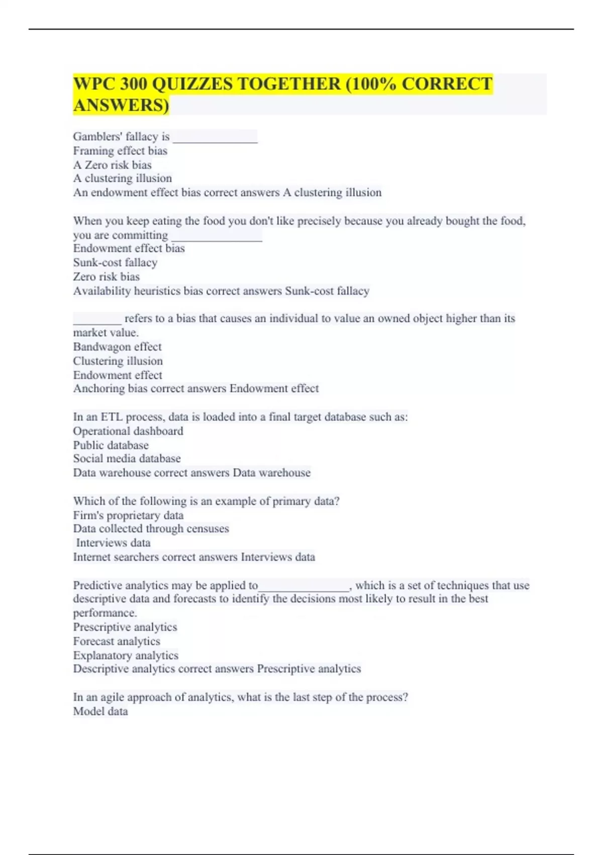 Gamblers' fallacy is ______________ Framing effect bias A Zero risk bias A clustering illusion An endowment effect bias correct answers A clustering illusion When you keep eating the food you don't like precisely because you already bought the food, you are committing _______________ Endowment effect bias Sunk-cost fallacy Zero risk bias Availability heuristics bias correct answers Sunk-cost fallacy ________ refers to a bias that causes an individual to value an owned object higher than its market value. Bandwagon effect Clustering illusion Endowment effect Anchoring bias correct answers Endowment effect In an ETL process, data is loaded into a final target database such as: Operational dashboard Public database Social media database Data warehouse correct answers Data warehouse Which of the following is an example of primary data? Firm's proprietary data Data collected through censuses Interviews data Internet searchers correct answers Interviews data Predictive analytics may be applied to_______________, which is a set of techniques that use descriptive data and forecasts to identify the decisions most likely to result in the best performance. Prescriptive analytics Forecast analytics Explanatory analytics Descriptive analytics correct answers Prescriptive analytics In an agile approach of analytics, what is the last step of the process? Model data