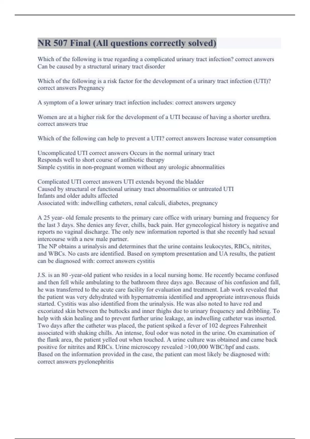 Which of the following is true regarding a complicated urinary tract infection? correct answers Can be caused by a structural urinary tract disorder Which of the following is a risk factor for the development of a urinary tract infection (UTI)? correct answers Pregnancy A symptom of a lower urinary tract infection includes: correct answers urgency Women are at a higher risk for the development of a UTI because of having a shorter urethra. correct answers true Which of the following can help to prevent a UTI? correct answers Increase water consumption Uncomplicated UTI correct answers Occurs in the normal urinary tract Responds well to short course of antibiotic therapy Simple cystitis in non-pregnant women without any urologic abnormalities Complicated UTI correct answers UTI extends beyond the bladder Caused by structural or functional urinary tract abnormalities or untreated UTI Infants and older adults affected Associated with: indwelling catheters, renal calculi, diabetes, pregnancy A 25 year- old female presents to the primary care office with urinary burning and frequency for the last 3 days. She denies any fever, chills, back pain. Her gynecological history is negative and reports no vaginal discharge. The only new information reported is that she recently had sexual intercourse with a new male partner. The NP obtains a urinalysis and determines that the urine contains leukocytes, RBCs, nitrites, and WBCs. No casts are identified. Based on symptom presentation and UA results, the patient can be diagnosed with: correct answers cystitis J.S. is an 80 -year-old patient who resides in a local nursing home. He recently became confused and then fell while ambulating to the bathroom three days ago. Because of his confusion and fall, he was transferred to the acute care facility for evaluation and treatment. Lab work revealed that the patient was very dehydrated with hypernatremia identified and appropriate intravenous fluids started. Cystitis was also identified from the urinalysis. He was also noted to have red and excoriated skin between the buttocks and inner thighs due to urinary frequency and dribbling. To help with skin healing and to prevent further urine leakage, an indwelling catheter was inserted. Two days after the catheter was placed, the patient spiked a fever of 102 degrees Fahrenheit associated with shaking chills. An intense, foul odor was noted in the urine. On examination of the flank area, the patient yelled out when touched. A urine culture was obtained and came back positive for nitrites and RBCs. Urine microscopy revealed >100,000 WBC/hpf and casts. Based on the information provided in the case, the patient can most likely be diagnosed with: correct answers pyelonephritis