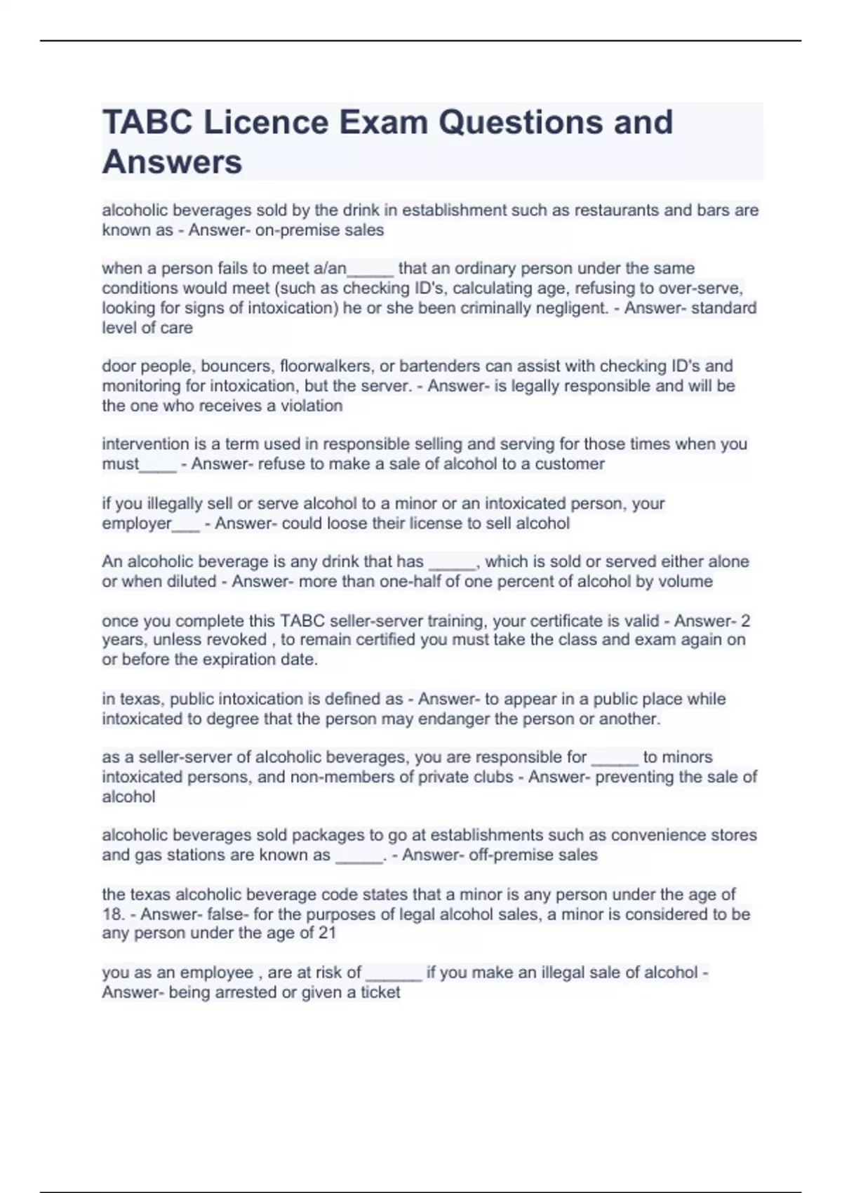 TABC Licence Exam Questions and Answers