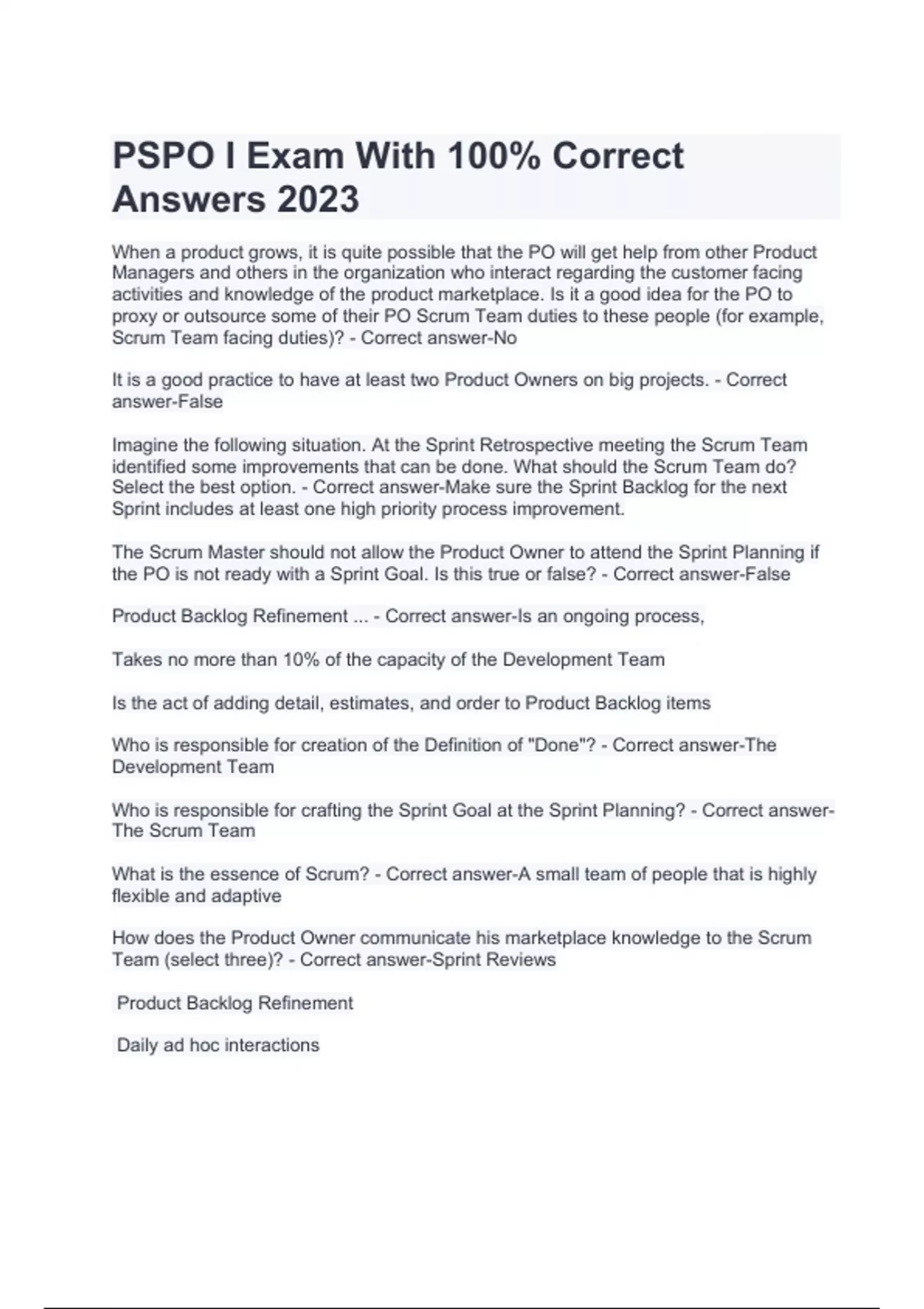PSPO I Exam With 100% Correct Answers 2023. When a product grows, it is quite possible that the PO will get help from other Product Managers and others in the organization who interact regarding the customer facing activities and knowledge of the product marketplace. Is it a good idea for the PO to proxy or outsource some of their PO Scrum Team duties to these people (for example, Scrum Team facing duties)? - Correct answer-No It is a good practice to have at least two Product Owners on big projects. - Correct answer-False Imagine the following situation. At the Sprint Retrospective meeting the Scrum Team identified some improvements that can be done. What should the Scrum Team do? Select the best option. - Correct answer-Make sure the Sprint Backlog for the next Sprint includes at least one high priority process improvement. The Scrum Master should not allow the Product Owner to attend the Sprint Planning if the PO is not ready with a Sprint Goal. Is this true or false? - Correct answer-False Product Backlog Refinement ... - Correct answer-Is an ongoing process, Takes no more than 10% of the capacity of the Development Team Is the act of adding detail, estimates, and order to Product Backlog items Who is responsible for creation of the Definition of "Done"? - Correct answer-The Development Team Who is responsible for crafting the Sprint Goal at the Sprint Planning? - Correct answerThe Scrum Team What is the essence of Scrum? - Correct answer-A small team of people that is highly flexible and adaptive How does the Product Owner communicate his marketplace knowledge to the Scrum Team (select three)? - Correct answer-Sprint Reviews Product Backlog Refinement Daily ad hoc interactions Who is responsible for managing the Product Backlog? - Correct answer-The Product Owner What are Product Backlog features? - Correct answer-It is dynamic .