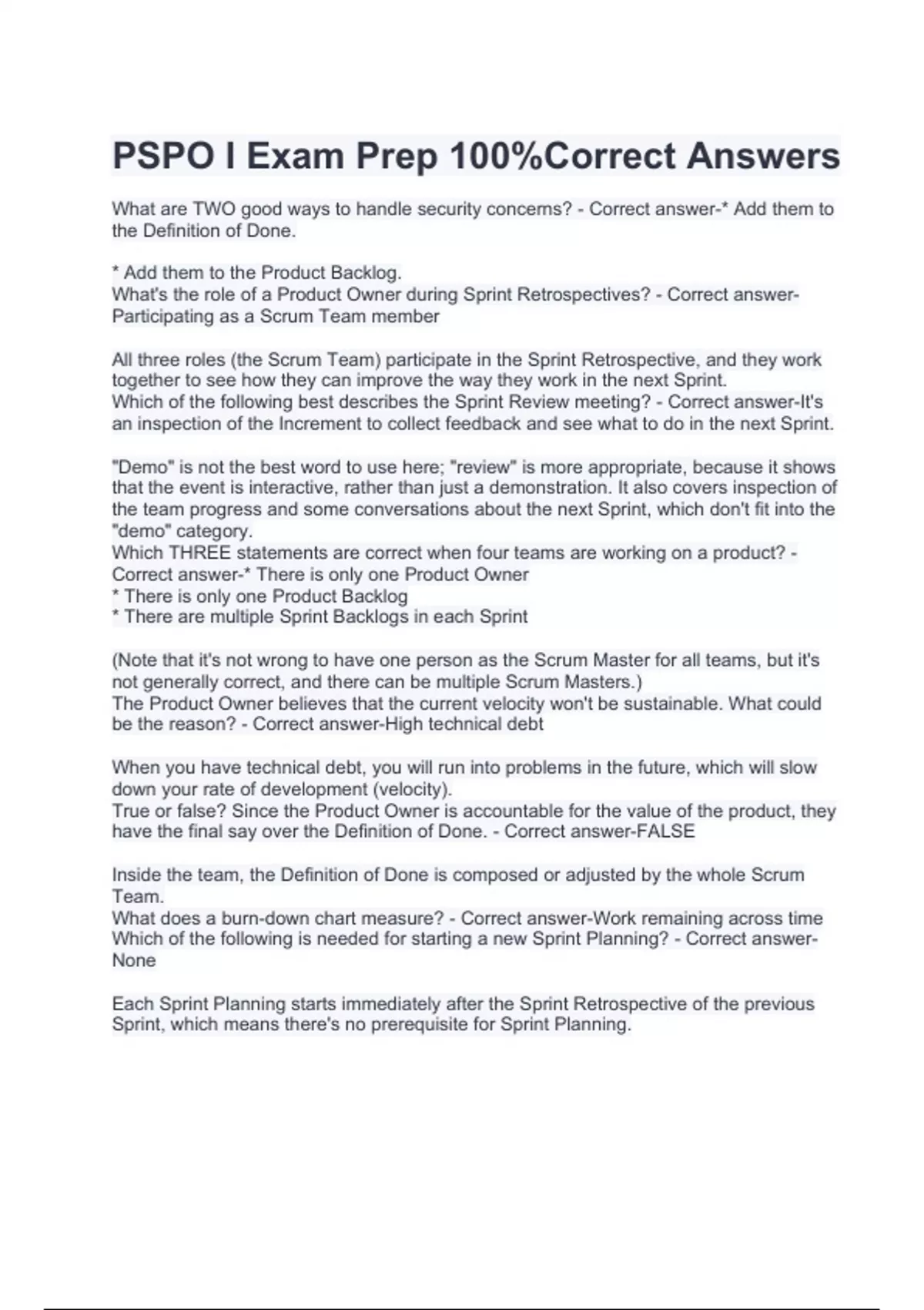 PSPO I Exam Prep 100%Correct Answers. What are TWO good ways to handle security concerns? - Correct answer-* Add them to the Definition of Done. * Add them to the Product Backlog. What's the role of a Product Owner during Sprint Retrospectives? - Correct answerParticipating as a Scrum Team member All three roles (the Scrum Team) participate in the Sprint Retrospective, and they work together to see how they can improve the way they work in the next Sprint. Which of the following best describes the Sprint Review meeting? - Correct answer-It's an inspection of the Increment to collect feedback and see what to do in the next Sprint. "Demo" is not the best word to use here; "review" is more appropriate, because it shows that the event is interactive, rather than just a demonstration. It also covers inspection of the team progress and some conversations about the next Sprint, which don't fit into the "demo" category. Which THREE statements are correct when four teams are working on a product? - Correct answer-* There is only one Product Owner * There is only one Product Backlog * There are multiple Sprint Backlogs in each Sprint (Note that it's not wrong to have one person as the Scrum Master for all teams, but it's not generally correct, and there can be multiple Scrum Masters.) The Product Owner believes that the current velocity won't be sustainable. What could be the reason? - Correct answer-High technical debt When you have technical debt, you will run into problems in the future, which will slow down your rate of development (velocity). True or false? Since the Product Owner is accountable for the value of the product, they have the final say over the Definition of Done. - Correct answer-FALSE.