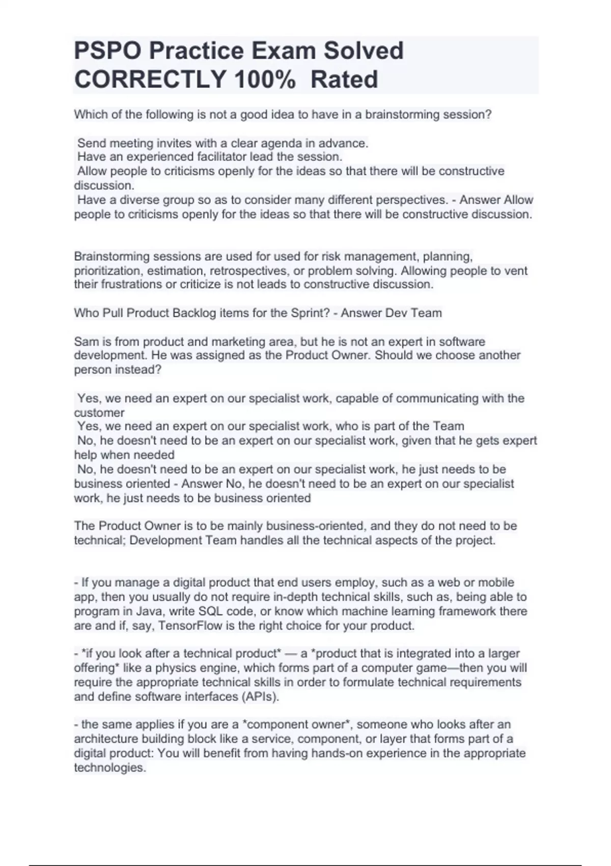 PSPO Practice Exam Solved CORRECTLY 100% Rated. Which of the following is not a good idea to have in a brainstorming session? Send meeting invites with a clear agenda in advance. Have an experienced facilitator lead the session. Allow people to criticisms openly for the ideas so that there will be constructive discussion. Have a diverse group so as to consider many different perspectives. - Answer Allow people to criticisms openly for the ideas so that there will be constructive discussion. Brainstorming sessions are used for used for risk management, planning, prioritization, estimation, retrospectives, or problem solving. Allowing people to vent their frustrations or criticize is not leads to constructive discussion. Who Pull Product Backlog items for the Sprint? - Answer Dev Team Sam is from product and marketing area, but he is not an expert in software development. He was assigned as the Product Owner. Should we choose another person instead? Yes, we need an expert on our specialist work, capable of communicating with the customer Yes, we need an expert on our specialist work, who is part of the Team No, he doesn't need to be an expert on our specialist work, given that he gets expert help when needed No, he doesn't need to be an expert on our specialist work, he just needs to be business oriented - Answer No, he doesn't need to be an expert on our specialist work, he just needs to be business oriented The Product Owner is to be mainly business-oriented, and they do not need to be technical; Development Team handles all the technical aspects of the project. - If you manage a digital product that end users employ, such as a web or mobile app, then you usually do not require in-depth technical skills, such as, being able to program in Java, write SQL code, or know which machine learning framework there are and if, say, TensorFlow is the right choice for your product. - *if you look after a technical product* — a *product that is integrated into a larger offering* like a physics engine, which forms part of a computer game—then you will require the appropriate technical skills in order to formulate technical requirements and define software interfaces (APIs). - the same applies if you are a *component owner*, someone who looks after an architecture building block like a service, component, or layer that forms part of a digital product: You will benefit from having hands-on experience in the appropriate technologies. PSPO Practice Exam Solved CORRECTLY 100% Rated How does an organization know that a product built through Scrum is successful? By measuring that velocity has increased since the last release By releasing often, and updating key performance indicators (KPIs) on value after every release and feeding this information back into work on the Product Backlog By measuring the actual time spent on development versus the time estimated for development By the Product Owner and stakeholders accepting the Increment at the Sprint Review - Answer By releasing often, and updating key performance indicators (KPIs) on value after every release and feeding this information back into work on the Product Backlog Scrum Teams deliver products iteratively and incrementally, maximizing opportunities for feedback. If a product isn't released, the opportunity to capture user and market feedback is lost. When should the Product Owner update the project plan? The Product Backlog is the plan in Scrum. It is updated as new information and insights emerge. Before the Sprint Planning to know how much work will have to be done in the Sprint. After the Daily Scrum to ensure an accurate daily overview of project progress. Scrum forbids having a project plan. The Product Owner shouldn't be occupied by that. It is work for the Project Manager. - Answer The Product Backlog is the plan in Scrum. It is updated as new information and insights emerge. The Product Backlog evolves as the product and the environment in which it will be used evolves. The Product Backlog is dynamic; it constantly changes to identify what the product needs to be appropriate, competitive, and useful. The Agile Principle "Simplicity - the art of maximizing the amount of work not done - is essential" is best summed up by which phrase? Maximize your work. Avoid waste. Work as little as possible. What matters is quantity. Only deliver once completed. - Answer Avoid waste. Once a Sprint begins, its duration is fixed and cannot be shortened or lengthened. The remaining events may end whenever the purpose of the event is achieved, ensuring an appropriate amount of time is spent without allowing waste in the process. How does Definition of "Done" help to the Scrum Team? Select the three most applicable items. PSPO Practice Exam Solved CORRECTLY 100% Rated DoD is used to assess when work is complete on the product Increment Guides the Development Team in knowing how many Product Backlog items it can select during a Sprint Planning DoD helps in inspection and adaptation DoD ensures artifact transparency DoD helps to calculate velocity of the Scrum Team - Answer DoD is used to assess when work is complete on the product Increment Guides the Development Team in knowing how many Product Backlog items it can select during a Sprint Planning DoD ensures artifact transparency According to Scrum guidelines, who is responsible for hiring or assigning a new person into a Team? ScrumMaster Product Owner This is outside of the scope of Scrum The self-managing Team - Answer This is outside of the scope of Scrum Hiring or assigning a new person is outside of the scope of scrum. How much work must a Scrum Team do to a Product Backlog it selects for a Sprint? As much work as the Team can fit into a Sprint. All of the analysis, design, development, testing and documentation work. The best amount of work the Team can do given that is usually impossible for QA to finish all of the testing that is needed to prove it can be shipped. As much work as it has told the Pr