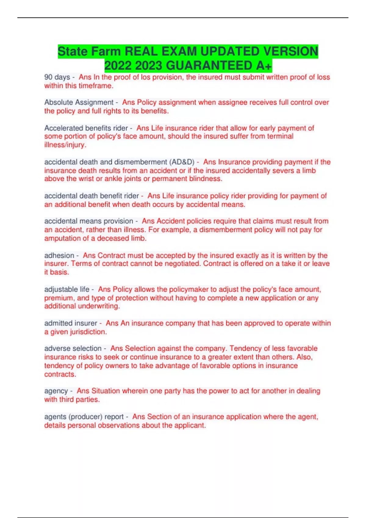 State Farm REAL EXAM UPDATED VERSION GUARANTEED A+